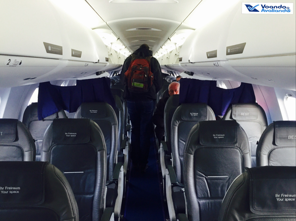 – meu assento original era o 25A, mas como o voo estava vazio (ocupação de 40%), sentei na poltrona 20A, uma janela no lado esquerdo do avião; o CRJ da Eurowings tem 25 fileiras e capacidade para 90 passageiros; os bancos são de couro na cor cinza escuro; o espaço para as pernas é bom e o bagageiro é bem pequeno: minha mochila coube certinho, mas de lado; o celular pode ficar no “modo avião ” durante todas as fases do voo (não há como carregar aparelhos eletrônicos)