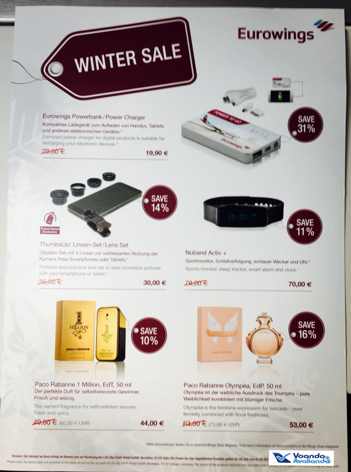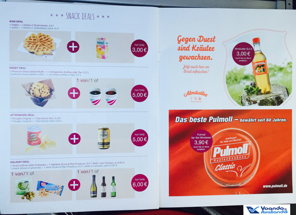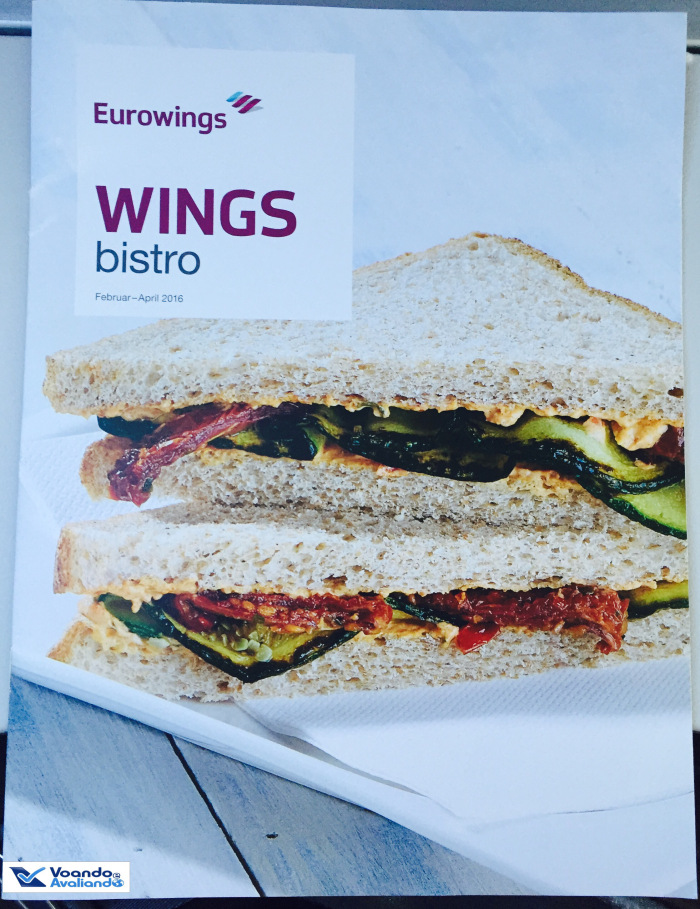 – não há sistema de vídeo para entreter os passageiros, mas a Eurowings oferece uma revista de bordo chamada “Wings”; nela, há ofertas de Free Shop e me interessei por 02 souvenirs da companhia: um chaveiro (por 3 euros) e uma maquete do A320 (por 9,90 euros); quando os produtos foram oferecidos, adivinha quem me atendeu?!? Minha “amiga”, que desta vez foi bem mais gentil e atenciosa (provavelmente, pensando na comissão dela)