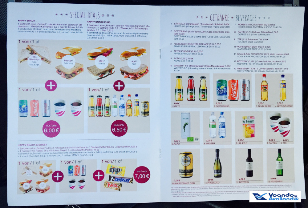 – eram 09:15h quando começou o serviço de bordo; primeiro, a comissária que “brigou” comigo passou oferecendo água aos passageiros, mas simplesmente me ignorou e passou direto: acho que ela ficou magoada; depois a outra comissária passou oferecendo itens do cardápio: é preciso pagar para comer (sanduíches custam 5 euros) ou beber algo (refrigerante custa 2,50 euros e garrafinha de vinho custa 4,90 euros)
