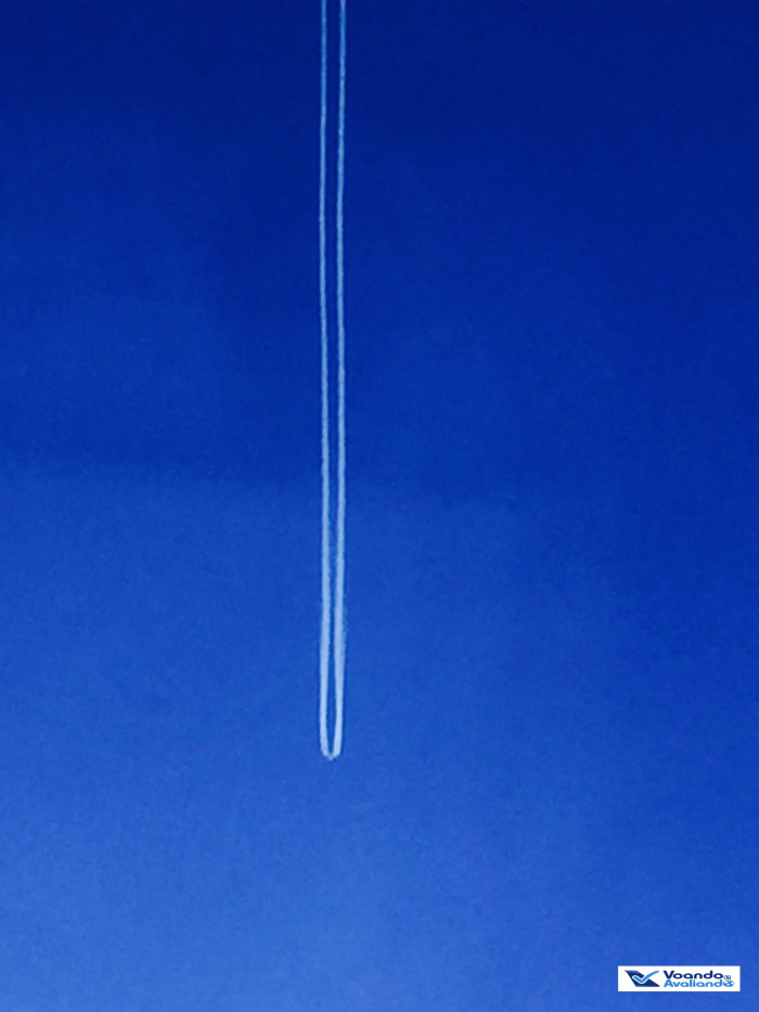 – a manhã estava com um tempo ótmo, ou seja, um cenário perfeito para tirar fotos; me chamou atenção a quantidade de aviões cruzando o céu europeu, deixando aquele rastro de fumaça branca para trás; este “fenômeno” se chama trilhas de condensação (em inglês se fala condensation trails) e é causada pelo contato dos gases quentes que saem da turbina dos aviões com o ar frio típico das grandes altitudes