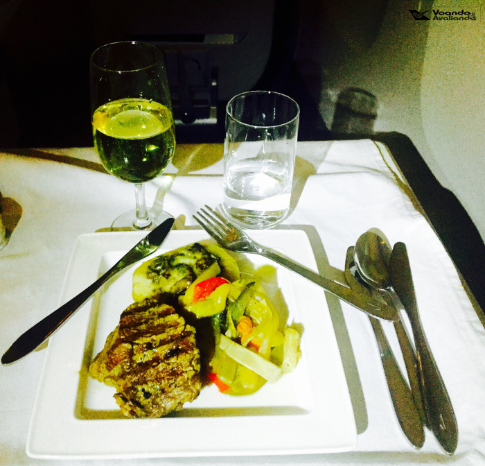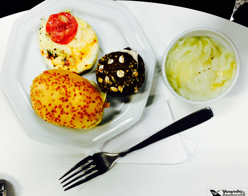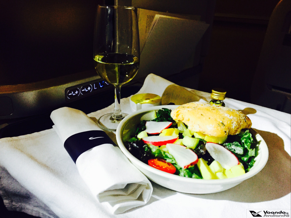 – ficar na última fileira da classe Executiva significa que você será atendido por último e traz sempre o risco de algumas opções do menu não estarem mais disponíveis e foi o que aconteceu comigo: a entrada de mozarela de búfala tinha acabado, a comissária se desculpou, pois somente 07 tinham sido embarcadas; como não gosto de salmão, a minha Entrada se resumiu à salada, que estava apetitosa; um chocolate é servido junto; para beber, pedi que a comissária escolhesse o champanhe para mim, ela ficou um pouco sem graça com o meu pedido, mas me serviu o brut