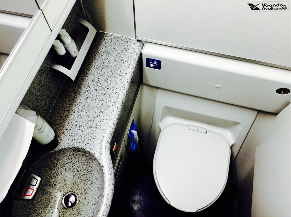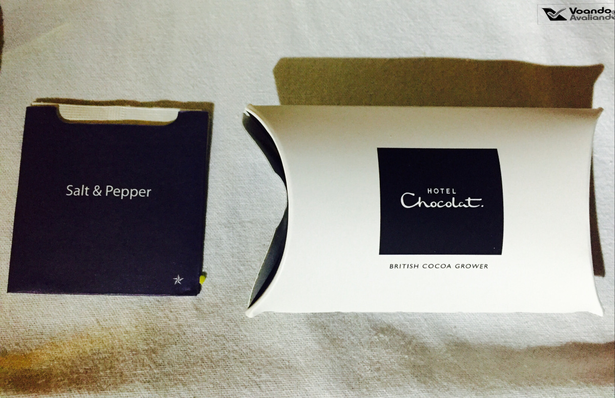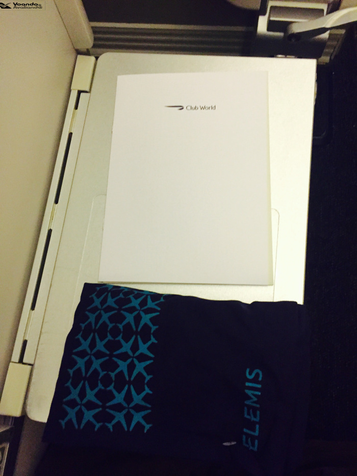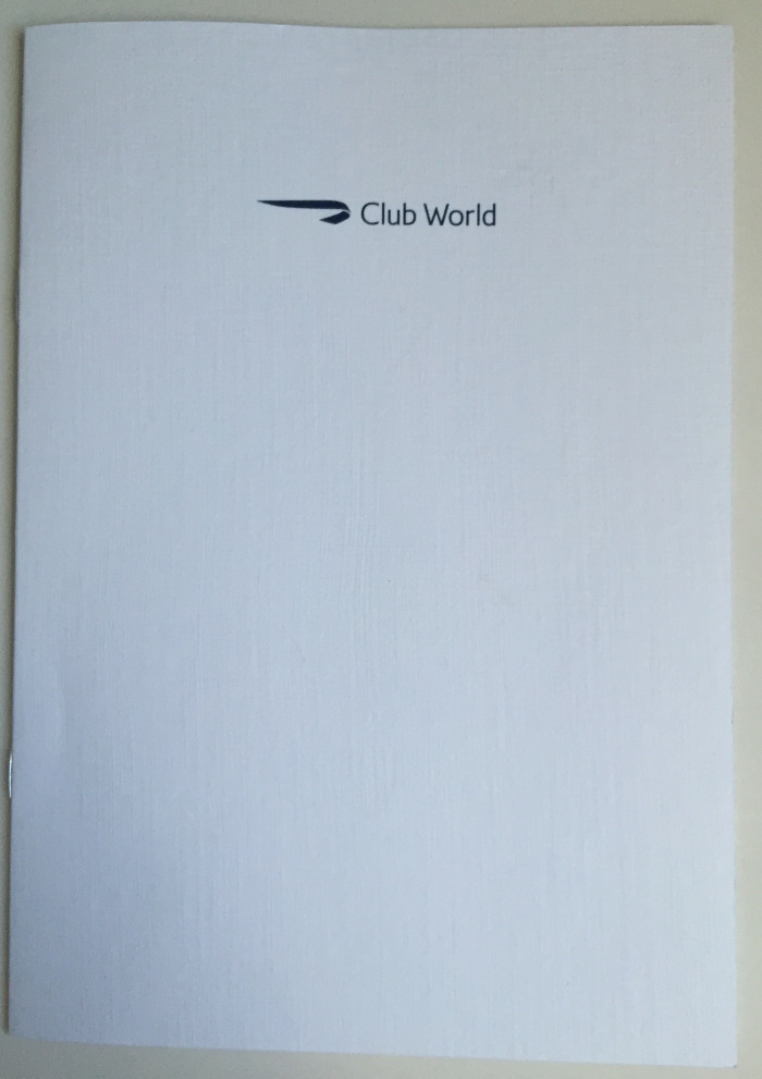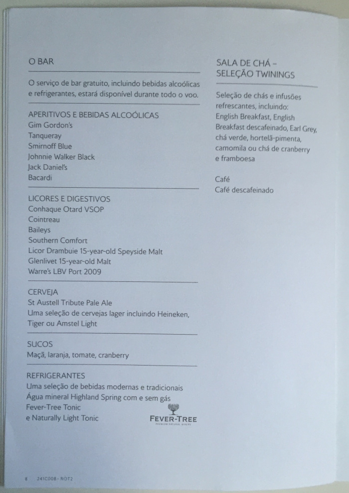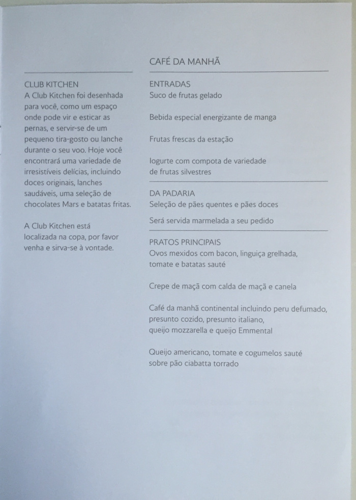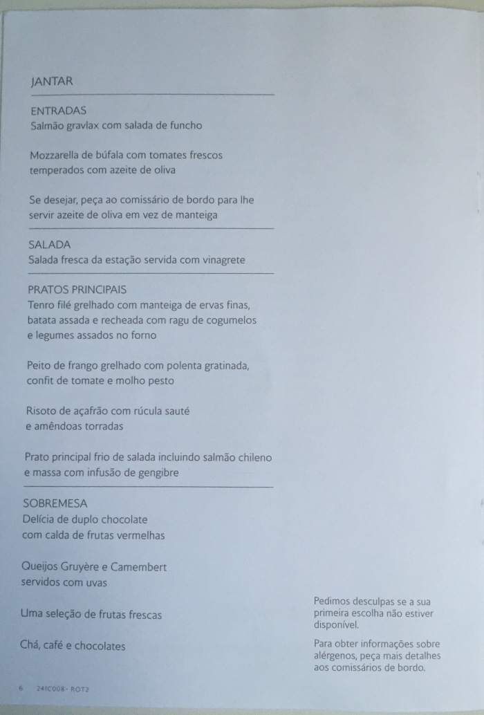 – tive que ficar no celular tentando resolver um monte de problemas do trabalho e simplesmente, sem querer, recusei o champanhe de boas-vindas; junto com a “necessaire”, que é básica e sem charme algum, o menu do serviço de bordo é entregue pela tripulação: é simples, feito de papelão branco, com as opções de jantar, café da manhã e bebidas diversas apresentadas em inglês e português