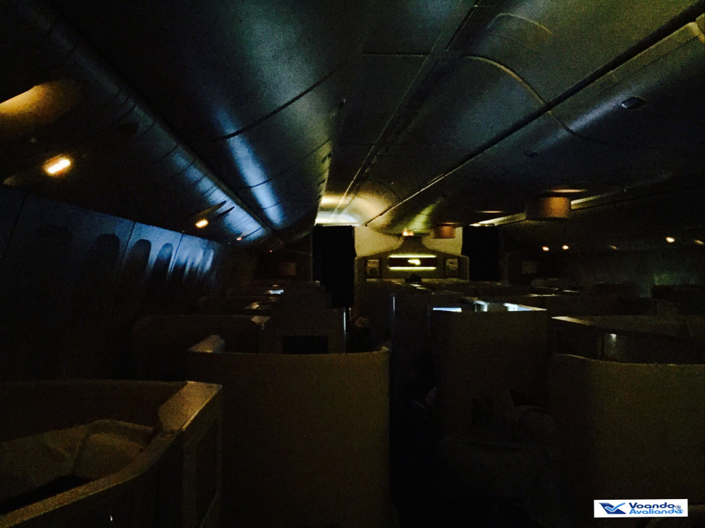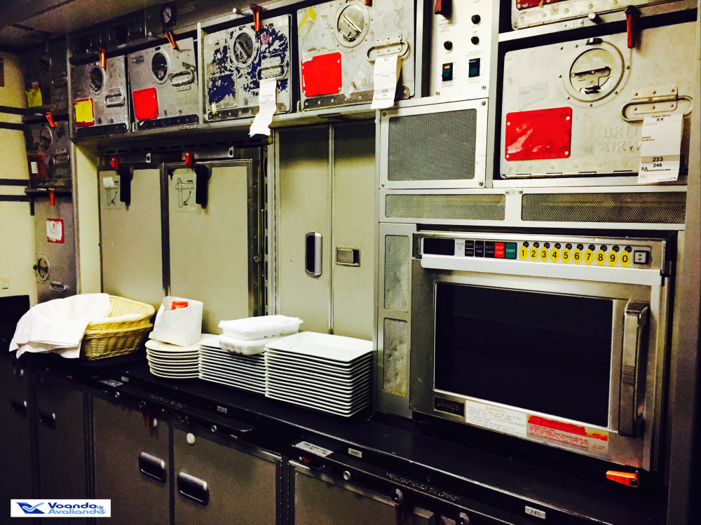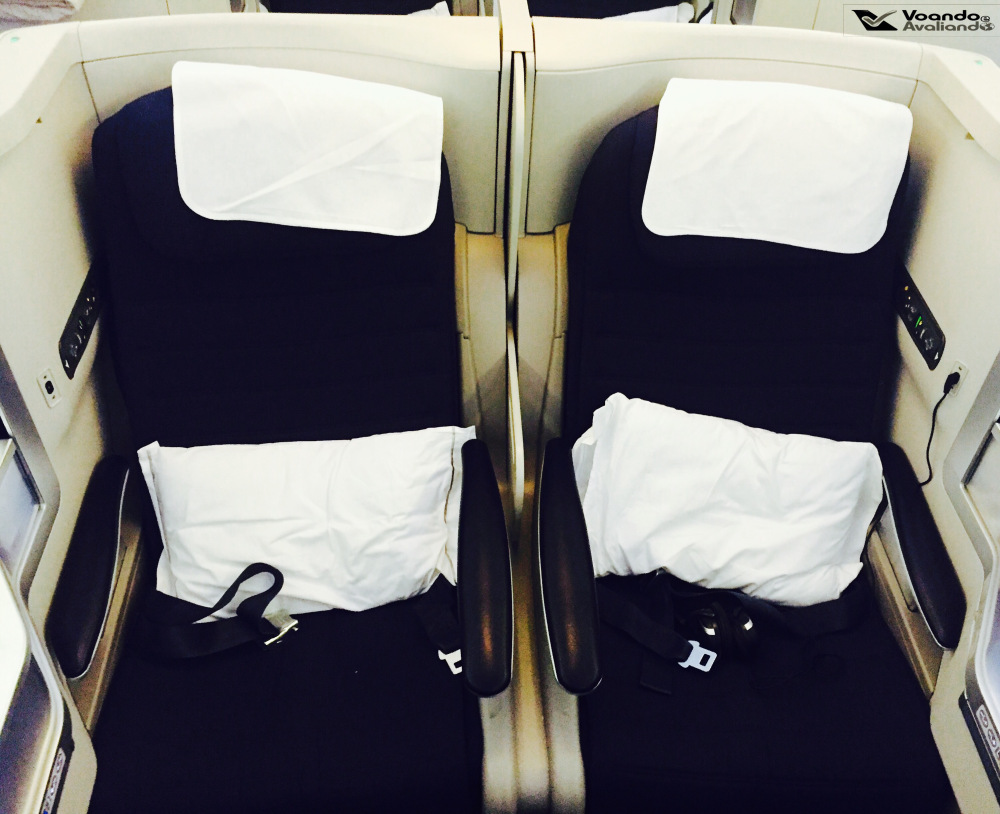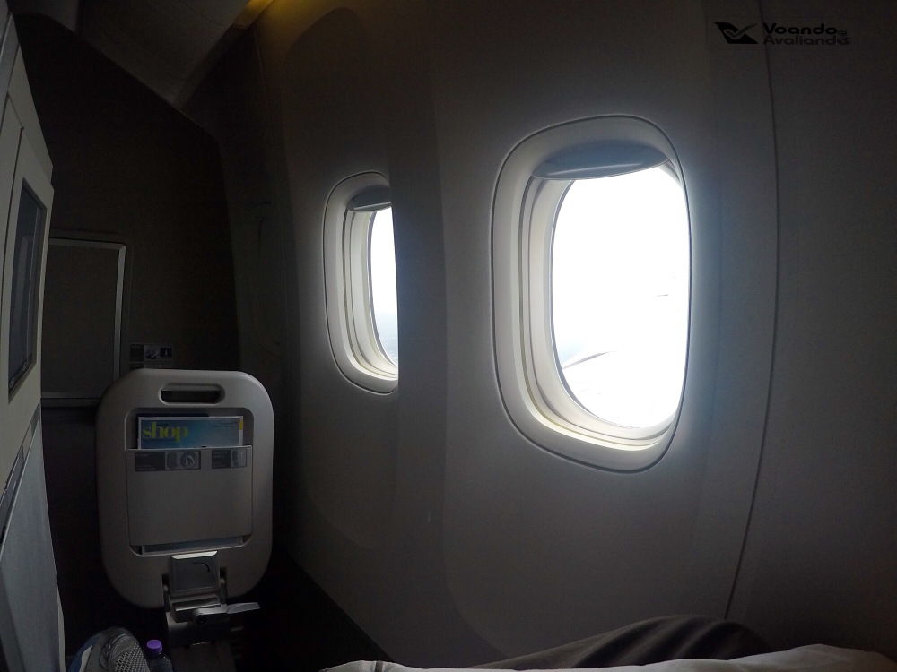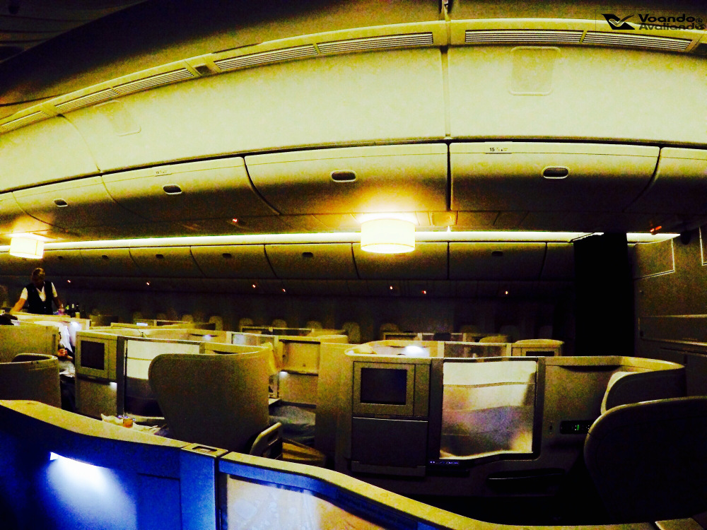 – o meu assento era o 15A, uma janela no lado esquerdo da aeronave; a configuração é 2x4x2 e a estrutura de poltronas que a British instalou na classe Executiva é peculiar: todos os passageiros sentados nas janelas viajam de costas para a frente do avião e de madrugada precisam “pular” as pernas daquelas pessoas que estão sentadas no assento do corredor caso queiram ir ao banheiro; da mesma forma, quem está sendo nos assentos do meio, não têm acesso direito ao corredor; justamente o meu assento é uma exceção a este problema, como é o último da classe Executiva, eu não precisei incomodar ninguém durante o voo