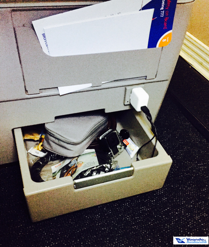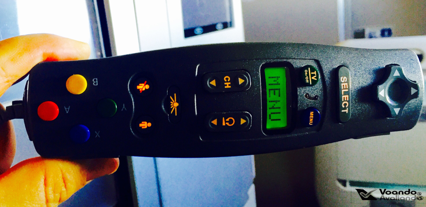 – os botões de comando da poltrona ficam localizados a esquerda, no console que divide as poltronas, perto do lugar de onde se puxa a mesa utilizada para a refeição; há 01 tomada para carregar aparelhos eletrônicos, localizada na parte inferior deste console, logo acima de uma gaveta, onde o passageiro pode guardar o sapato ou objetos pessoais