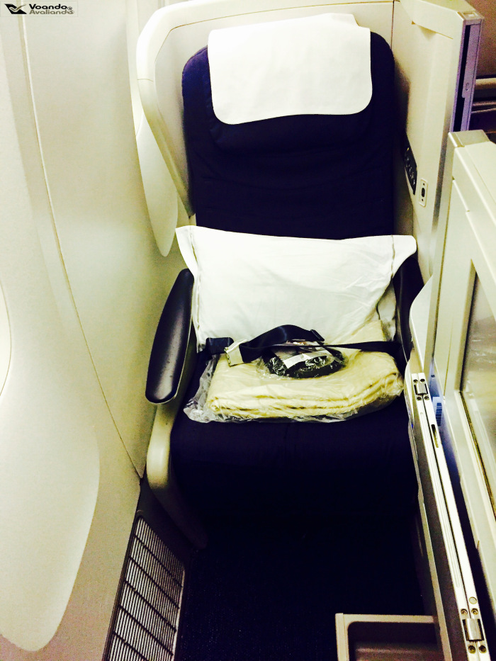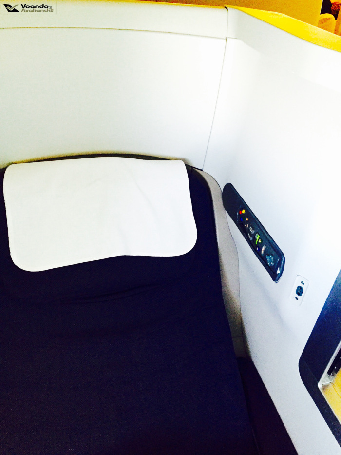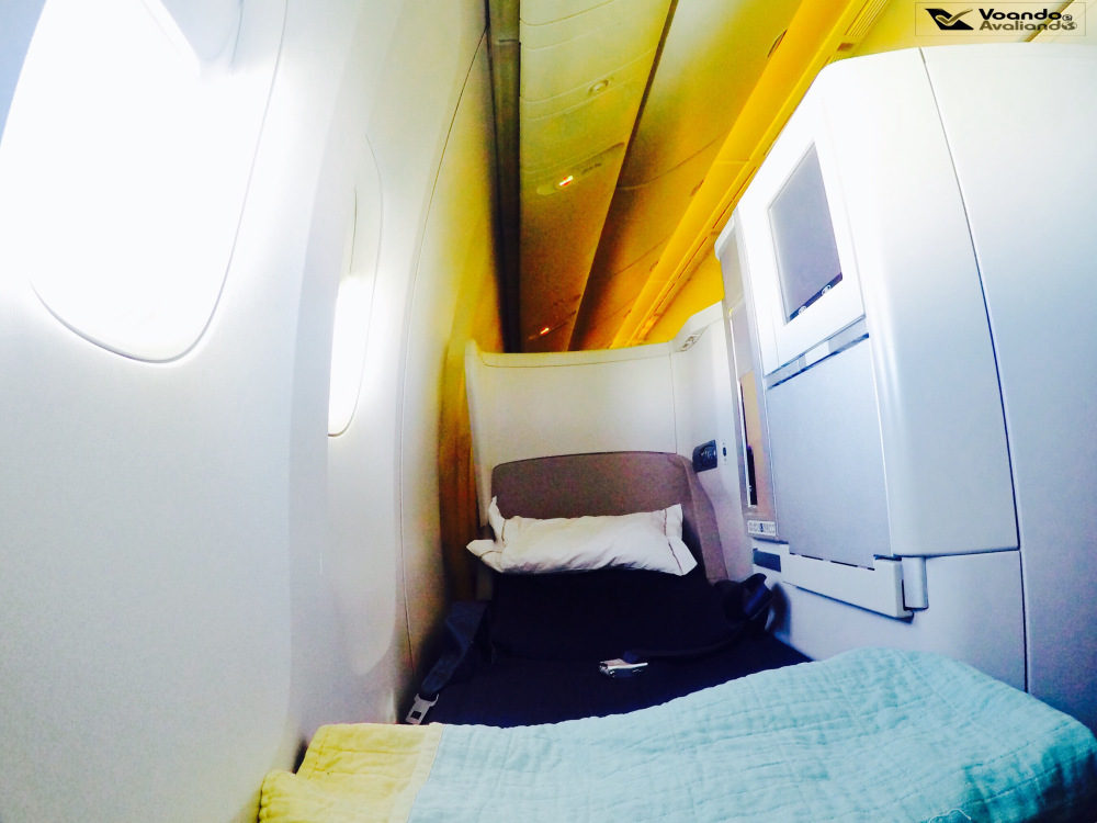 – a poltrona se transforma em uma cama “full flat” (180 graus) com o acionamento de um único botão: o assento se projeta para frente e o apoio de pés abaixado completa a estrutura, que poderia ser um pouco mais larga; o travesseiro é de bom tamanho e o cobertor é confortável, um ambiente propício para um descanso merecido e necessário