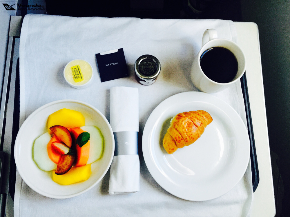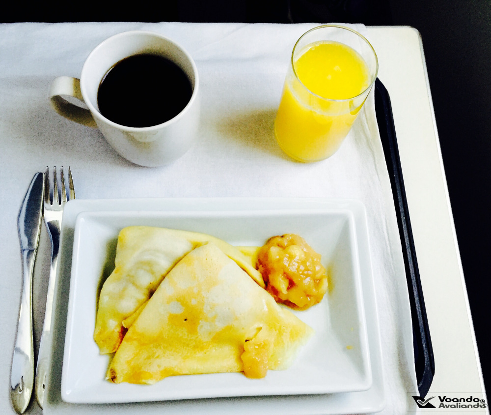 – primeiro, foi servido um prato de frutas, pães a escolher (eu peguei um croissant) com manteiga e geléia de morango; café e chá foram oferecidos; depois é servido o prato quente: neste voo, um crepe de maçã, que estava simplesmente maravilhoso; pedi um suco de laranja para acompanhar; mais uma vez, a atitude das comissárias foi perfeita