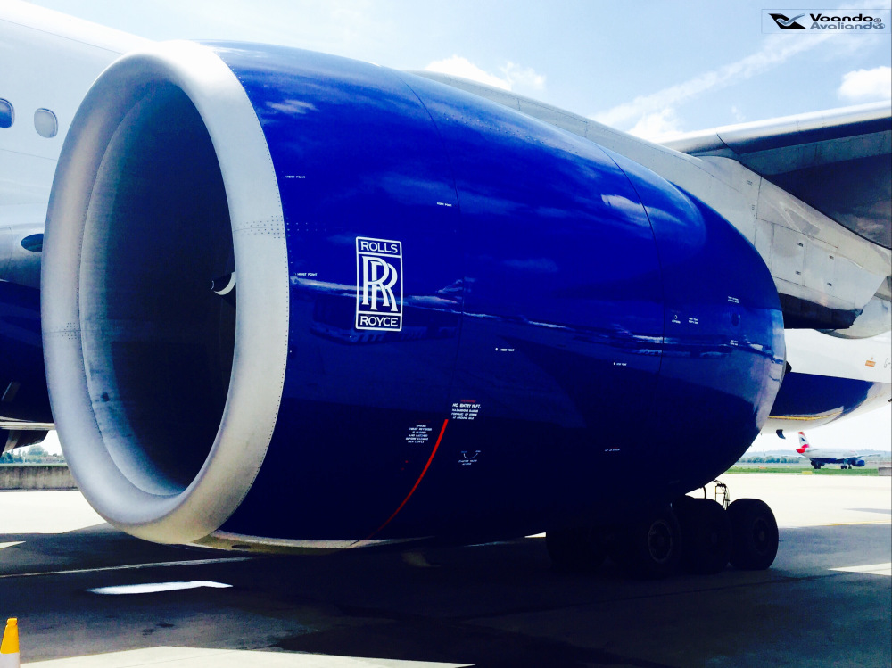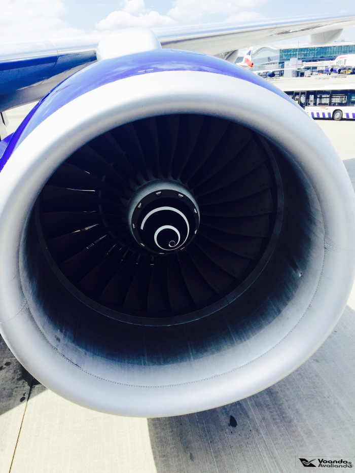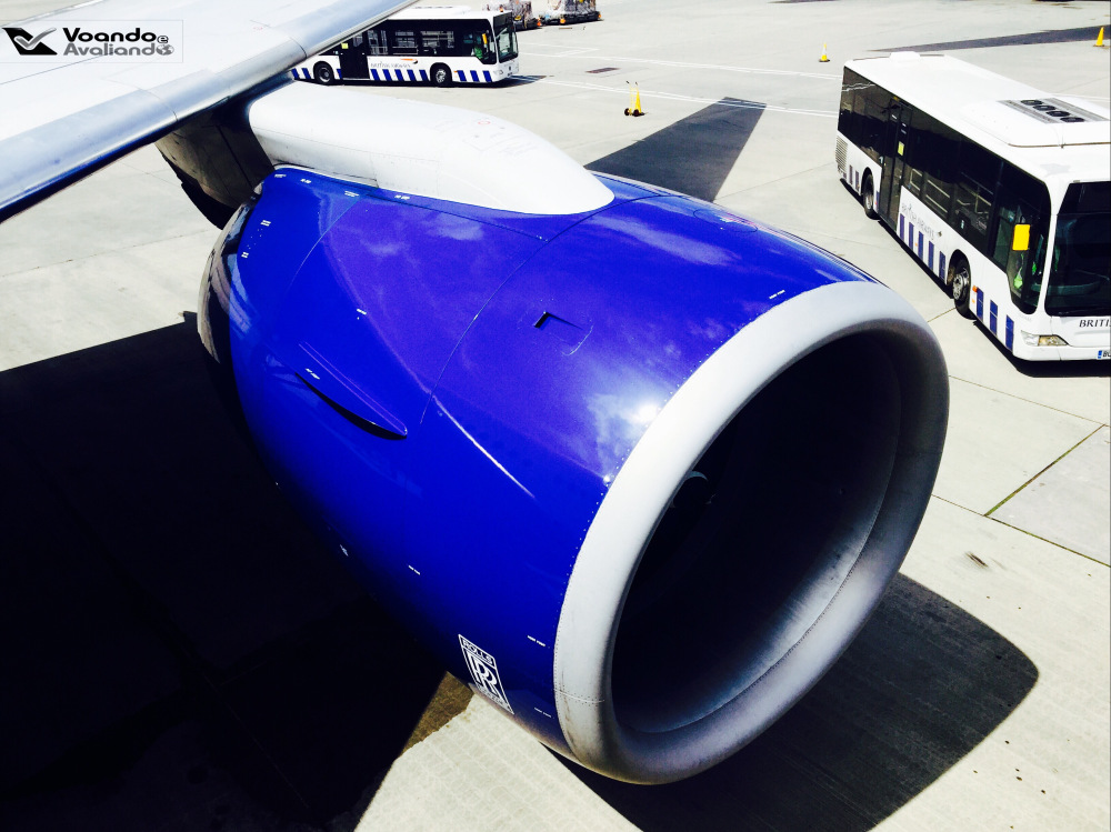 – depois de um longo taxiamento, encostamos em uma posição remota às 12:55h, encerrando com sucesso mais um voo transatlântico da maior companhia aérea do Reino Unido; na descida do avião e antes de entrar no ônibus que aguardava os passageiros, foi possível tirar fotos da enorme turbina esquerda do Boeing 777, fabricada pela Rolls Royce