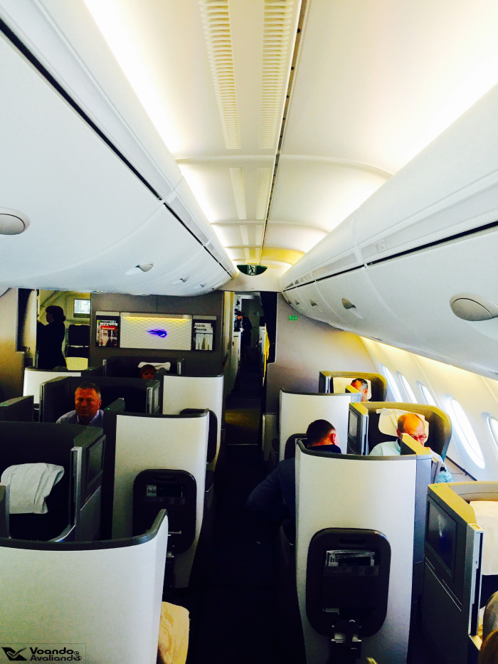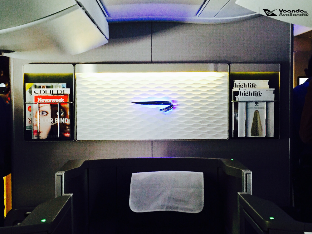 – meu assento era o 59J, no upper deck (segundo andar) um corredor no lado direito da aeronave, última fileira da classe Executiva; o tipo e a disposição das poltronas eram os mesmos do Boeing 777 que me levou do Rio de Janeiro para Londres; a única diferença relevante que reparei foi a seguinte: as pessoas sentadas na janela têm a disposição 02 “porta-trecos” adicionais, enquanto os passageiros do corredor têm somente uma gaveta para guardar seus pertences; a configuração do 2º andar do A380 na Business é 2x3x2 (no 1º andar é 2x4x2)