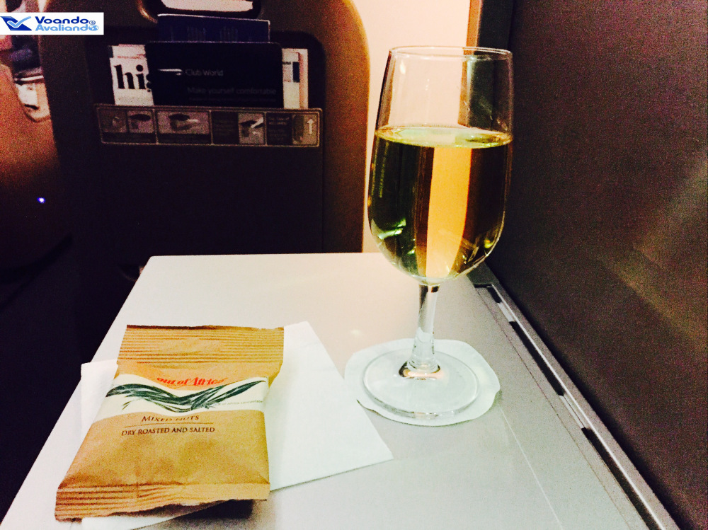 – pensei que não iam me oferecer o champanhe de boas-vindas, mas ele chegou logo antes da Chefe de Cabine solicitar que todos colocassem os celulares em modo avião; saboreei minha bebida, junto com um pacotinho de snacks enquanto as instruções de segurança eram exibidas no sistema de video