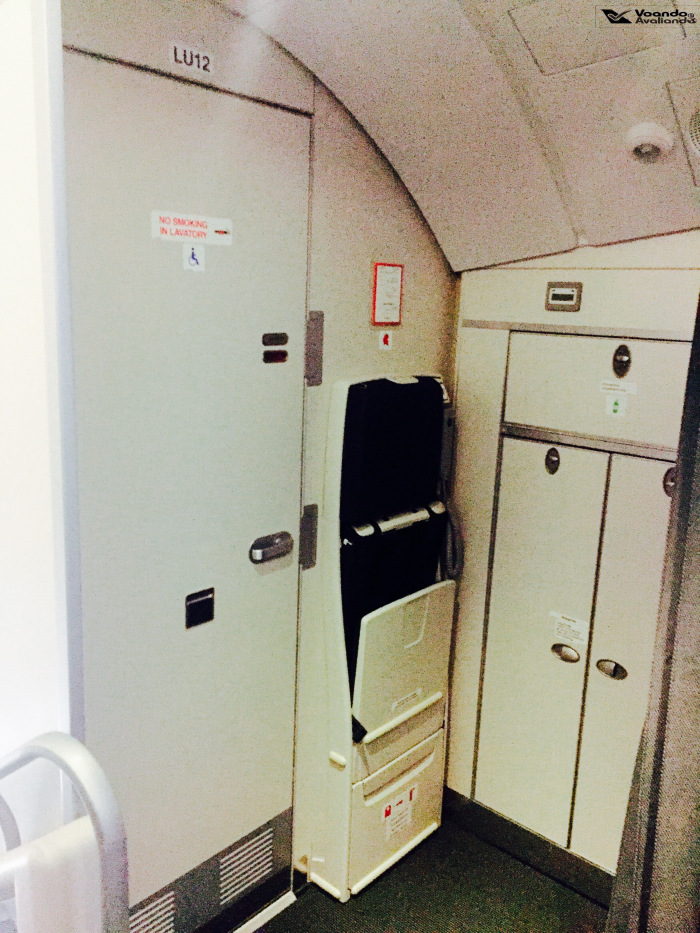 – já estávamos na fase final do voo, mas ainda deu tempo de fazer um novo tour, agora na parte de trás da aeronave; a escada que leva ao primeiro andar é curva e fica em frente à parte operacional (galley) da aeronave, onde a tripularão organiza o serviço de bordo