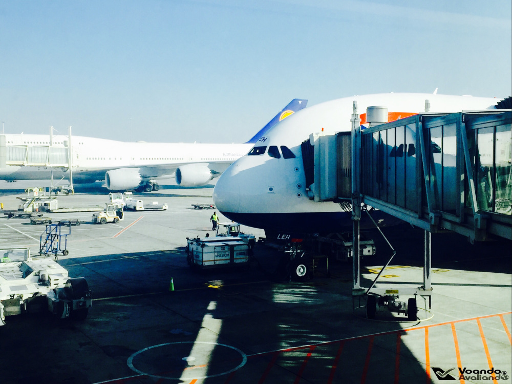 – depois que desci do trem, a caminhada até o portão foi rápida, cheguei lá antes das 18:40h; uma grande janela de vidro exibia o A380 sendo preparado para o voo, uma ótima oportunidade para contemplar este avião de design único