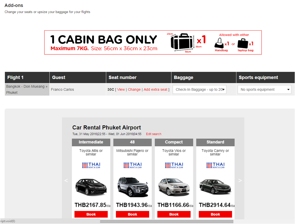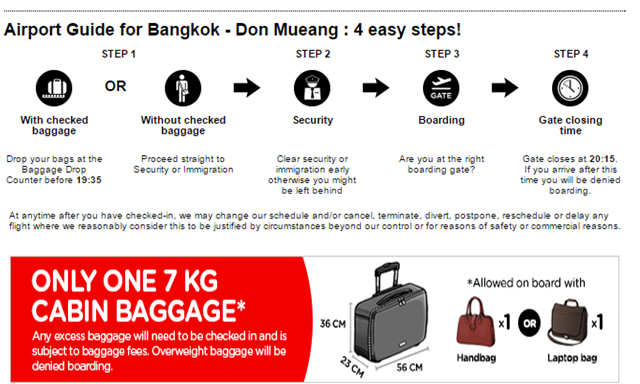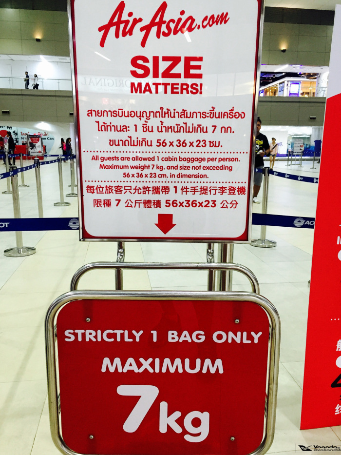 – uma semana antes do embarque, recebi um e-mail informando que o check-in já podia ser feito, achei prudente fazer logo; o processo é simples e rápido, a AirAsia aproveita a oportunidade para oferecer aluguel de carros e faz alerta sobre os horários máximos de check-in ou de despacho das malas no aeroporto, além de reforçar as restrições e regras da bagagem de mão (uma mala de mão de até 07 quilos + uma bolsa ou mochila com laptop)
