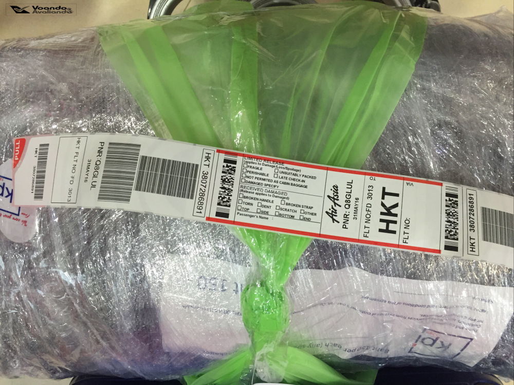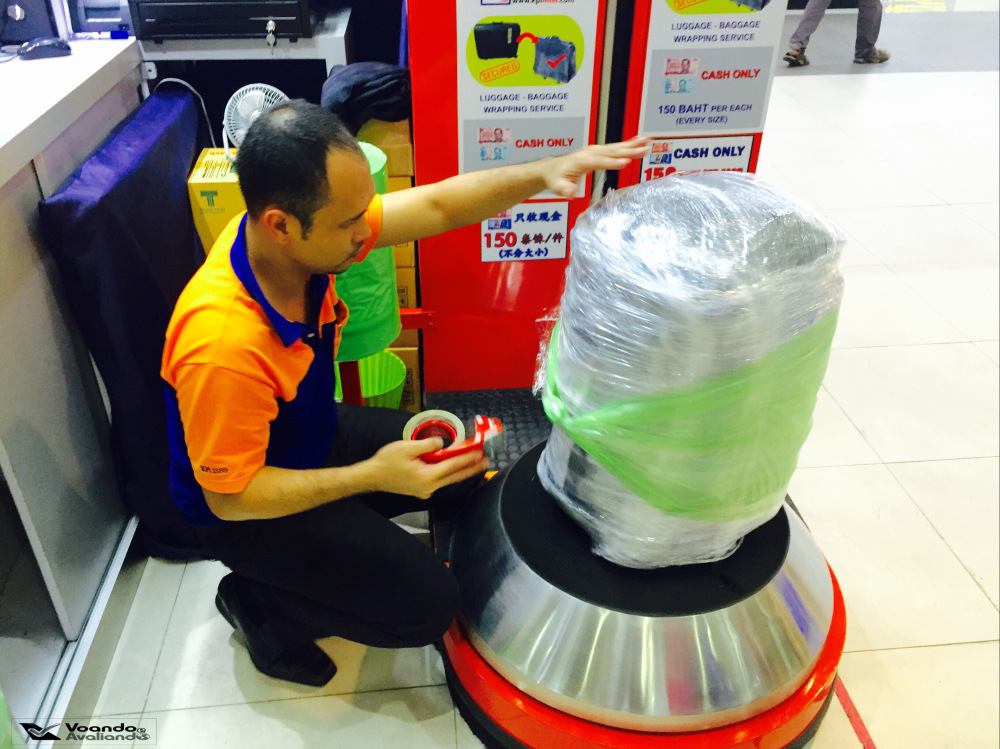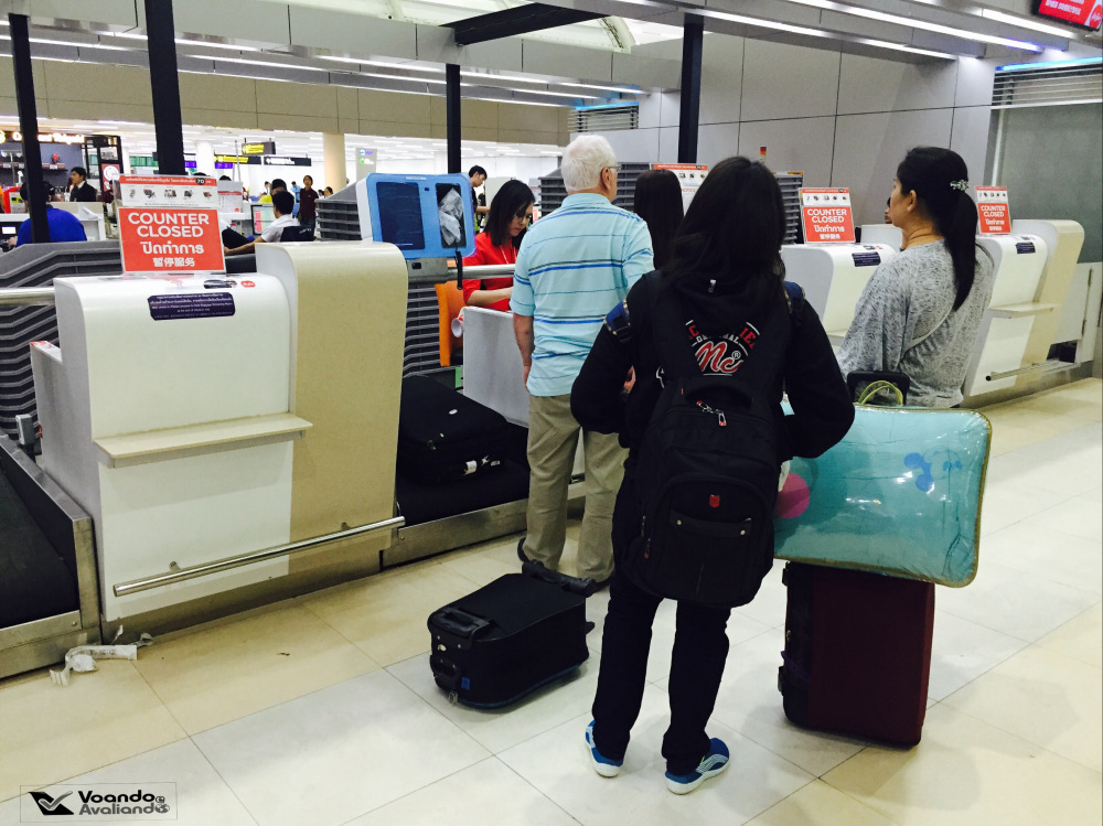 – a bolsa grande que comprei por R$ 35,00 no bairro tailandês de Chinatown (o tiozinho vendedor me garantiu: “It’s strong, strong!”) não aguentou a carga adicional que transferi (ela acabou ficando com 19 quilos, no limite da franquia de 20 quilos que eu tinha direito): quando fui fechar, ela rasgou, tive que gastar 150 Bahts (R$ 15,00) para botar aquele plástico de proteção; há diversos totens de “self check-in“, onde os passageiros podem agilizar o procedimento e imprimir a etiqueta da bagagem, para depois ir para uma fila específica (geralmente menor) dos guichês de “Baggage Drop“