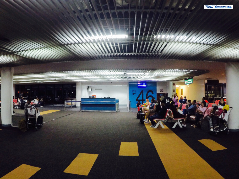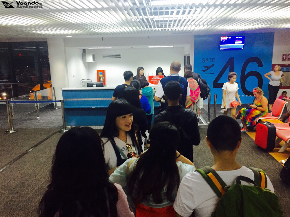 – o meu embarque seria feito no Portão 46, localizado à direita do controle de segurança, foram 05 minutos de caminhada até chegar no salão em frente, mais uma vez, muito espaço com muitas cadeiras e grandes janelas de vidro, com ótima visão para o pátio de manobras, proporcionando conforto aos passageiros; na parte interna do balcão do portão, uma balança está à mostra, ou seja, se os funcionários da AirAsia desconfiarem o peso das bagagens de mão, a situação indesejável de ter que despachá-las pode ocorrer