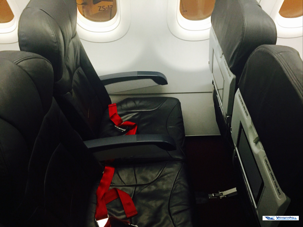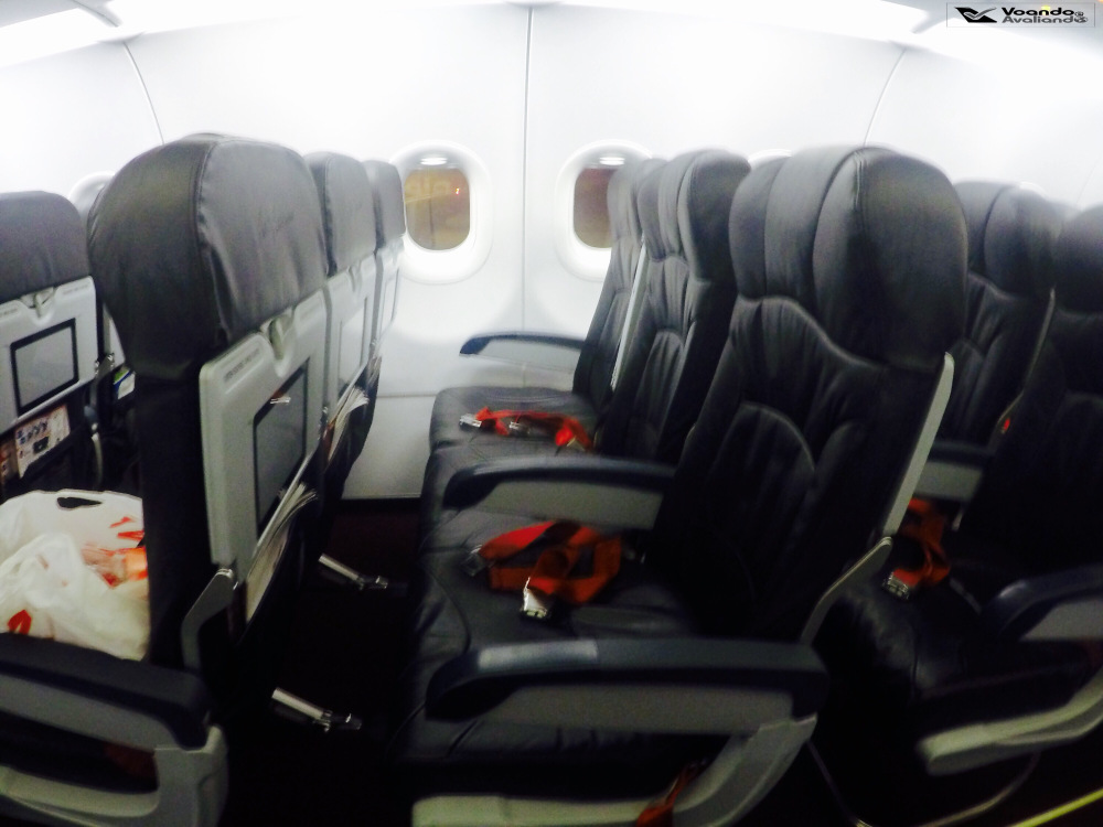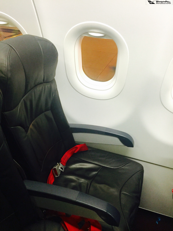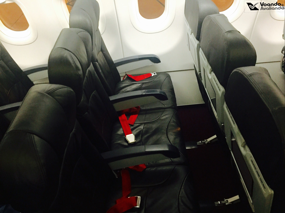 – os bancos são de couro azul bem escuro, com cintos de segurança em tecido vermelho; eu estava sentado na poltrona 30C, um corredor na parte esquerda do avião, penúltima fileira; o espaço para as pernas é bem reduzido, mesmo para uma pessoa com estatura mediana como eu; as poltronas com mais espaço para as pernas (para as quais é preciso pagar para sentar – os chamados “hot seats“) são indentificadas com um encosto de cabeça de couro vermelho