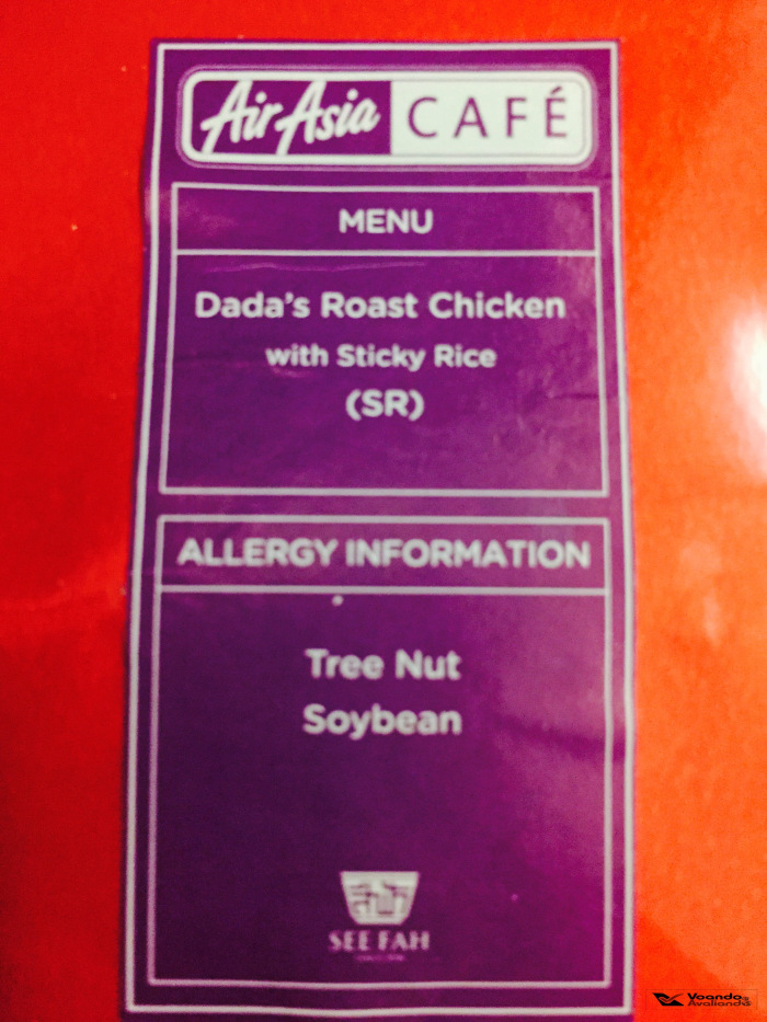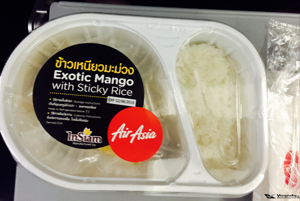– além disso, a AirAsia oferece várias opções de refeições que podem ser compradas previamente por 120 Bahts (R$ 12,00) e sobremesas a 70 Bahts (R$ 7,00); decidi ver como funciona e se este tipo de serviço é eficiente, comprando o Dada’s Roast Chicken with Sticky Rice (+) Exotic Mango with Sticky Rice, gastando um total de 190 Bahts (R$ 19,00) para garantir minha refeição a bordo; as opção são variadas, fica até difícil escolher