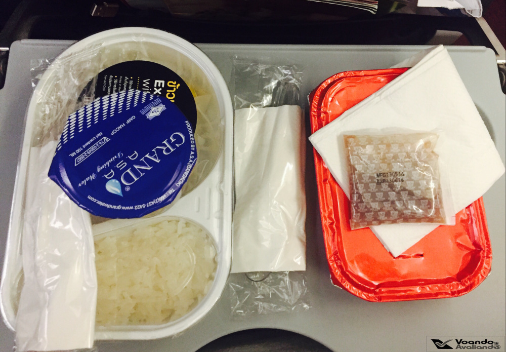 – a minha refeição comprada previamente pela Internet chegou direitinho: o frango com arroz estava gostoso, me surpreendi, tinha sabor de comida mesmo, foi uma surpresa agradável; a sobremesa me fez lembrar de minha infância e da minha avó paterna: arroz doce, além de um pedaço de manga que parecia um sorvete, muito bom; o único problema foi a falta de espaço para comer, a pequena distância entre as poltronas torna o ato de comer desconfortável