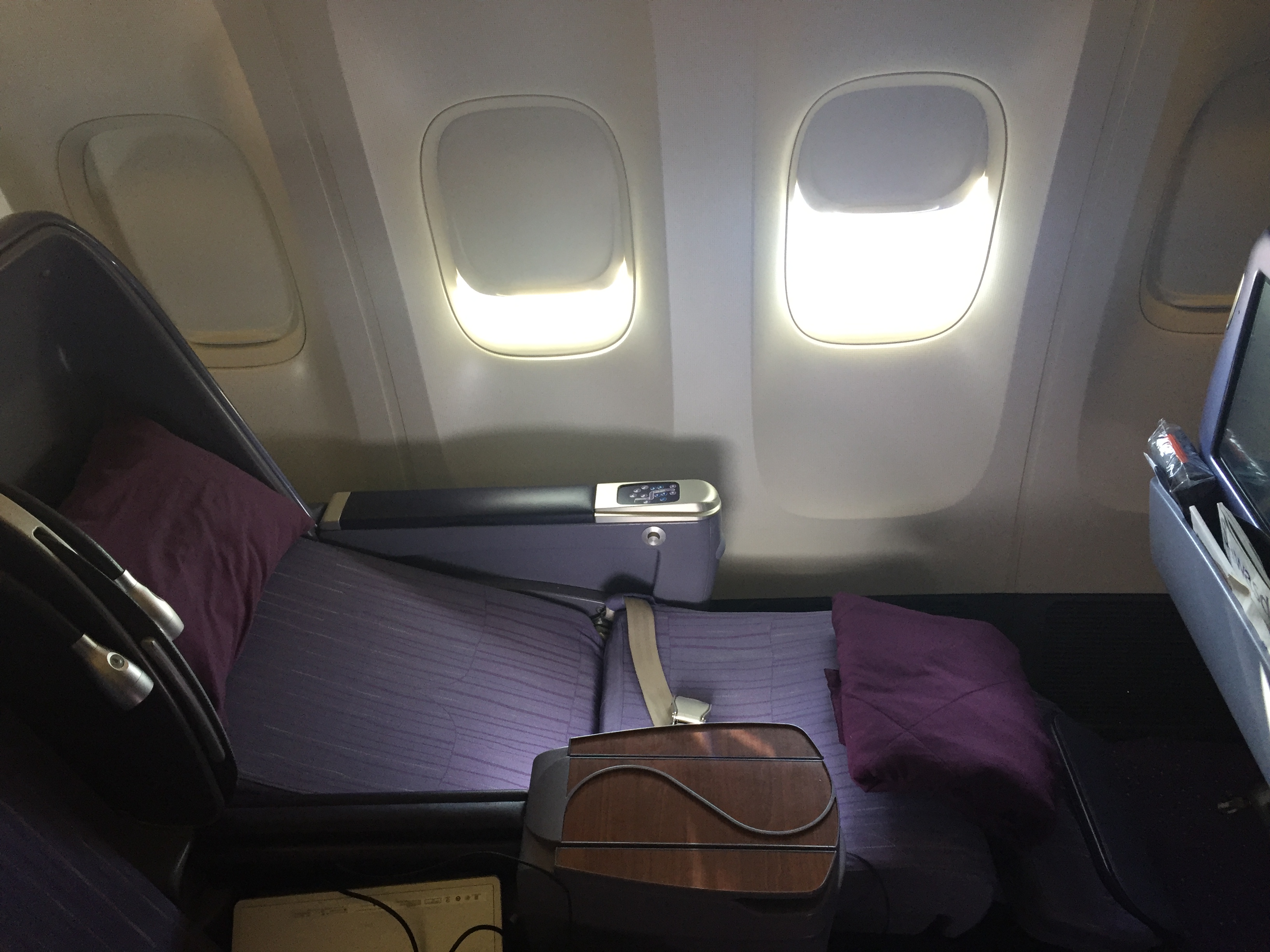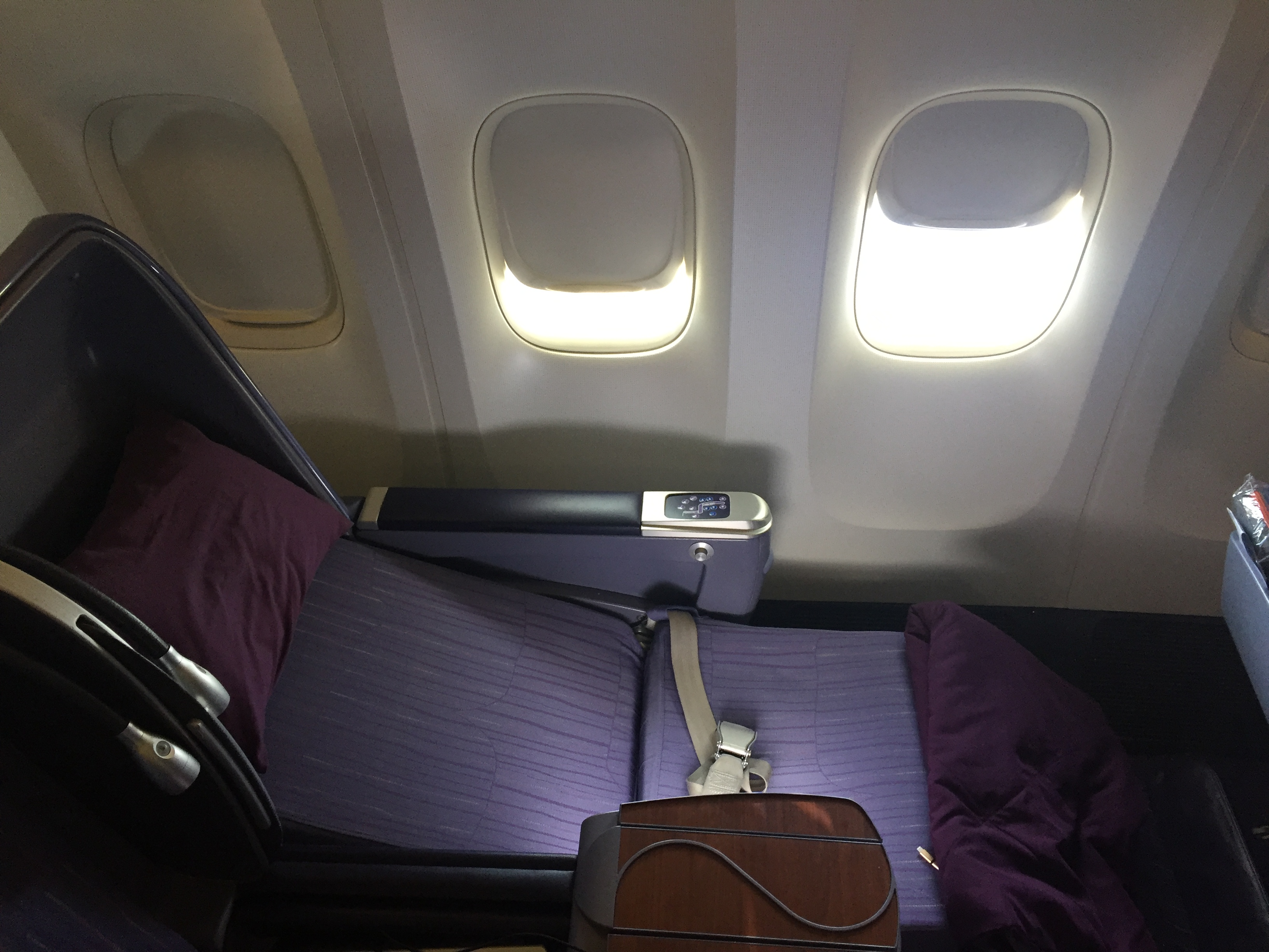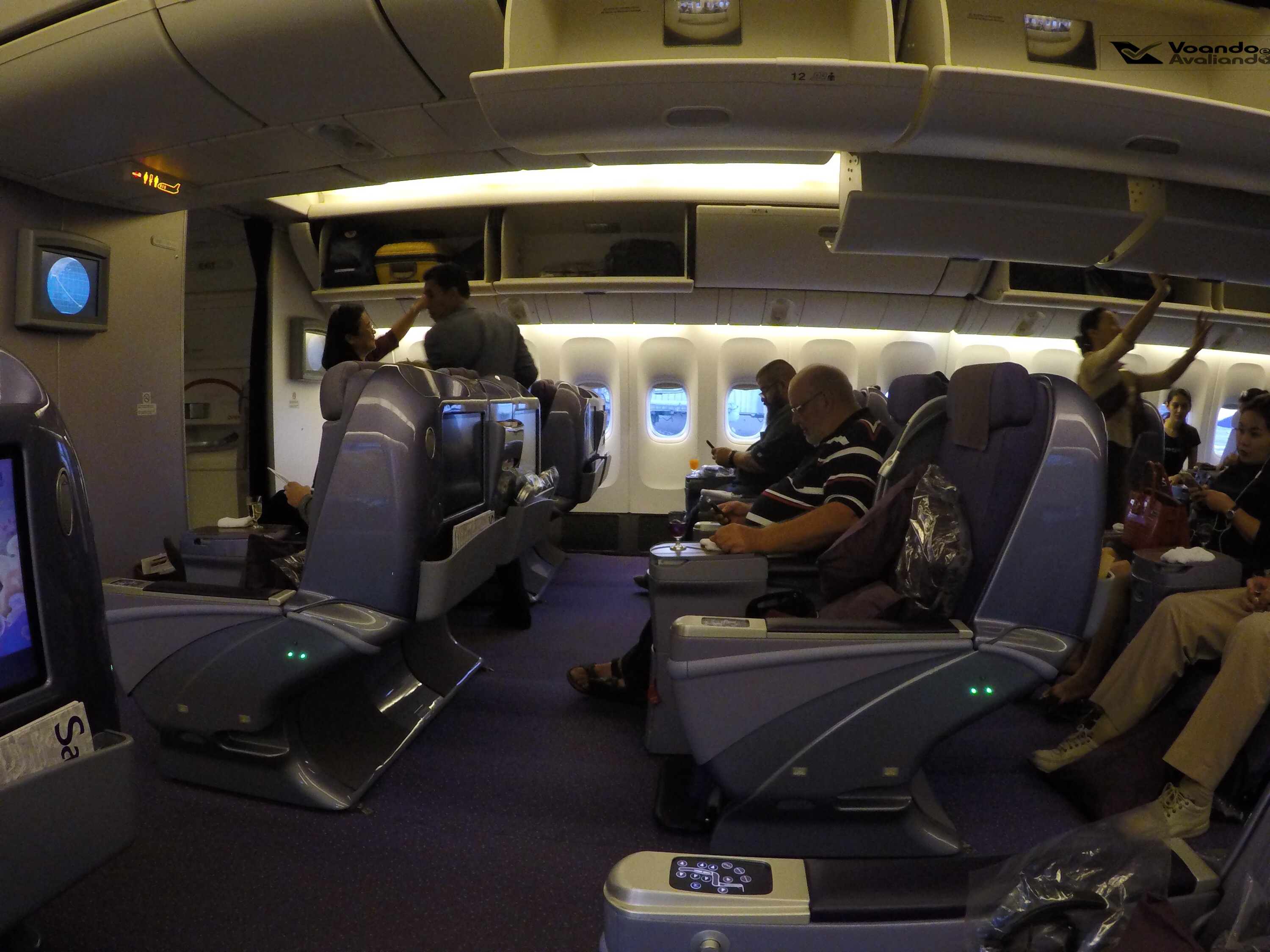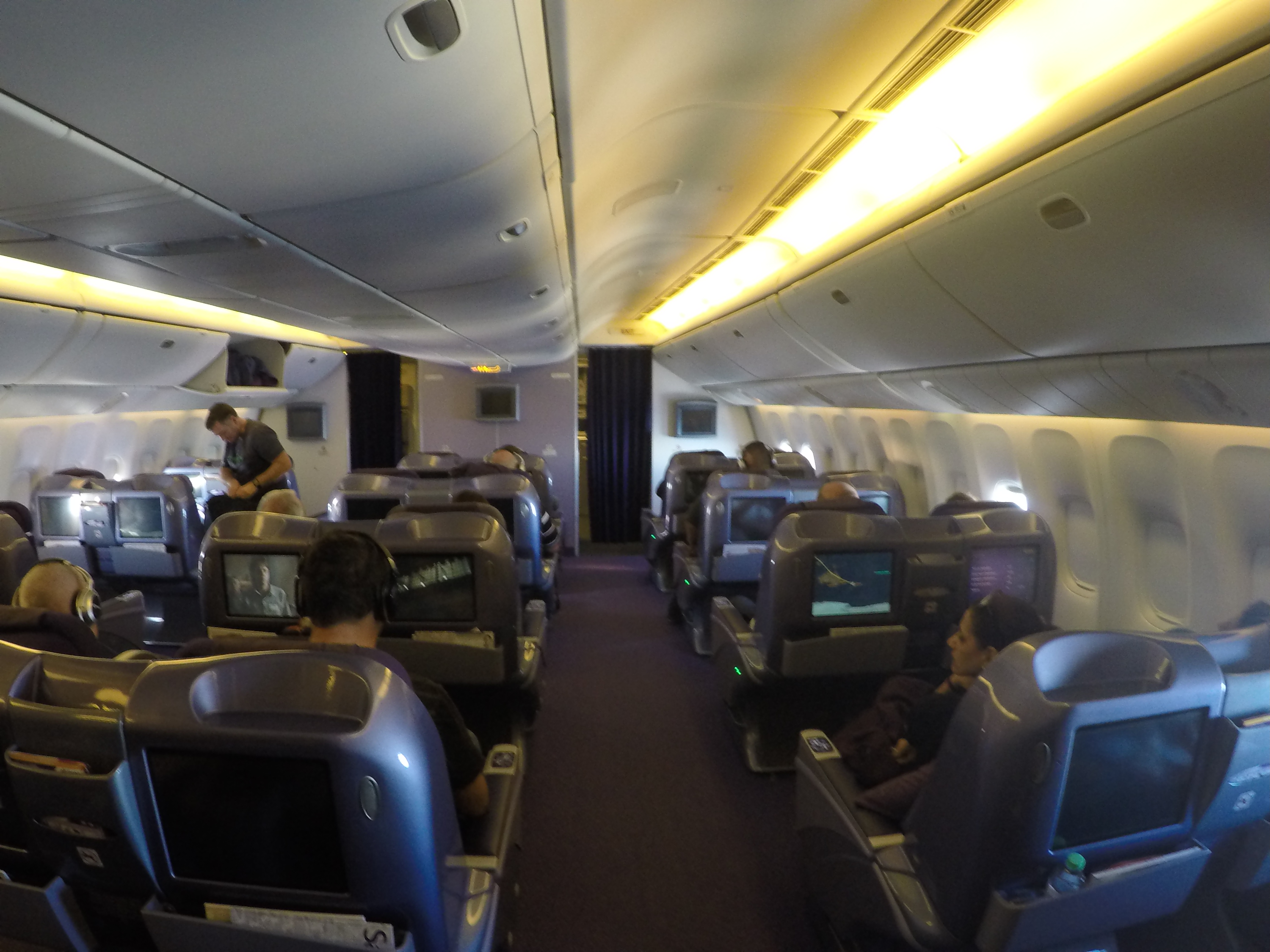 – eu estava sentado na 2ª fileira, no lado do esquerdo, assento 12A; eu teria a companhia de um neo-zelandes ao meu lado nas mais de 10 horas de voo que teria pela frente, ele seria o meu obstáculo nas idas ao banheiro durante a viagem: este é um problema crônico das configurações antigas de classe Executiva, não há acesso direto ao corredor aos passageiros sentados na janela; da mesma forma que no voo entre Phuket e Bangkok, as poltronas eram antigas, mas eram um pouco melhor, tive a sensação de ter mais espaço lateral do que aquela experimentada no primeiro voo