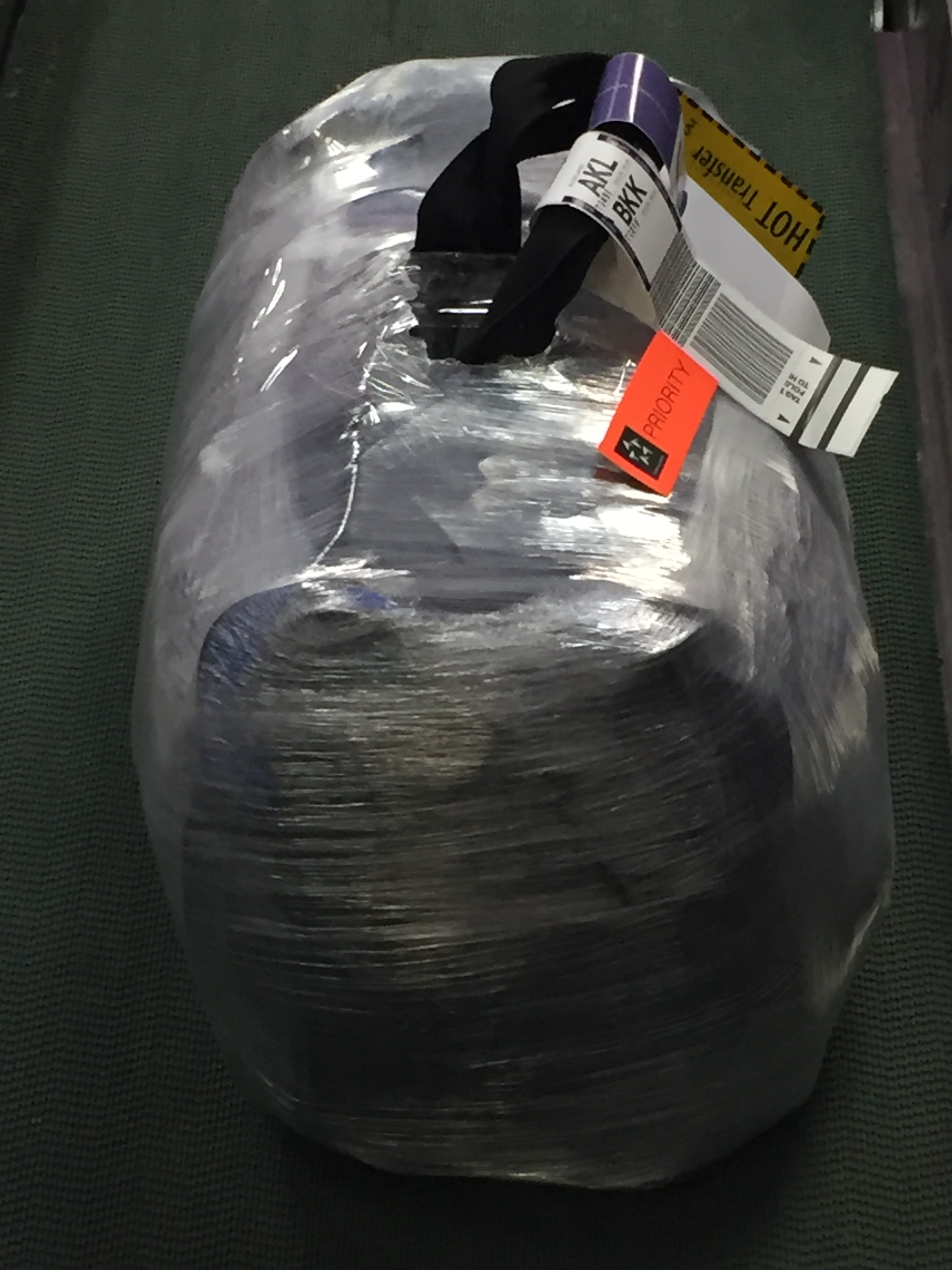 – apesar de ter costurado a mala comprada no bairro Chinatown em Bangkok (de péssima qualidade, durou algumas horas apenas), achei prudente empacotar a mala com aquele plástico de proteção, gastando 200thb (cerca de R$ 20,00)