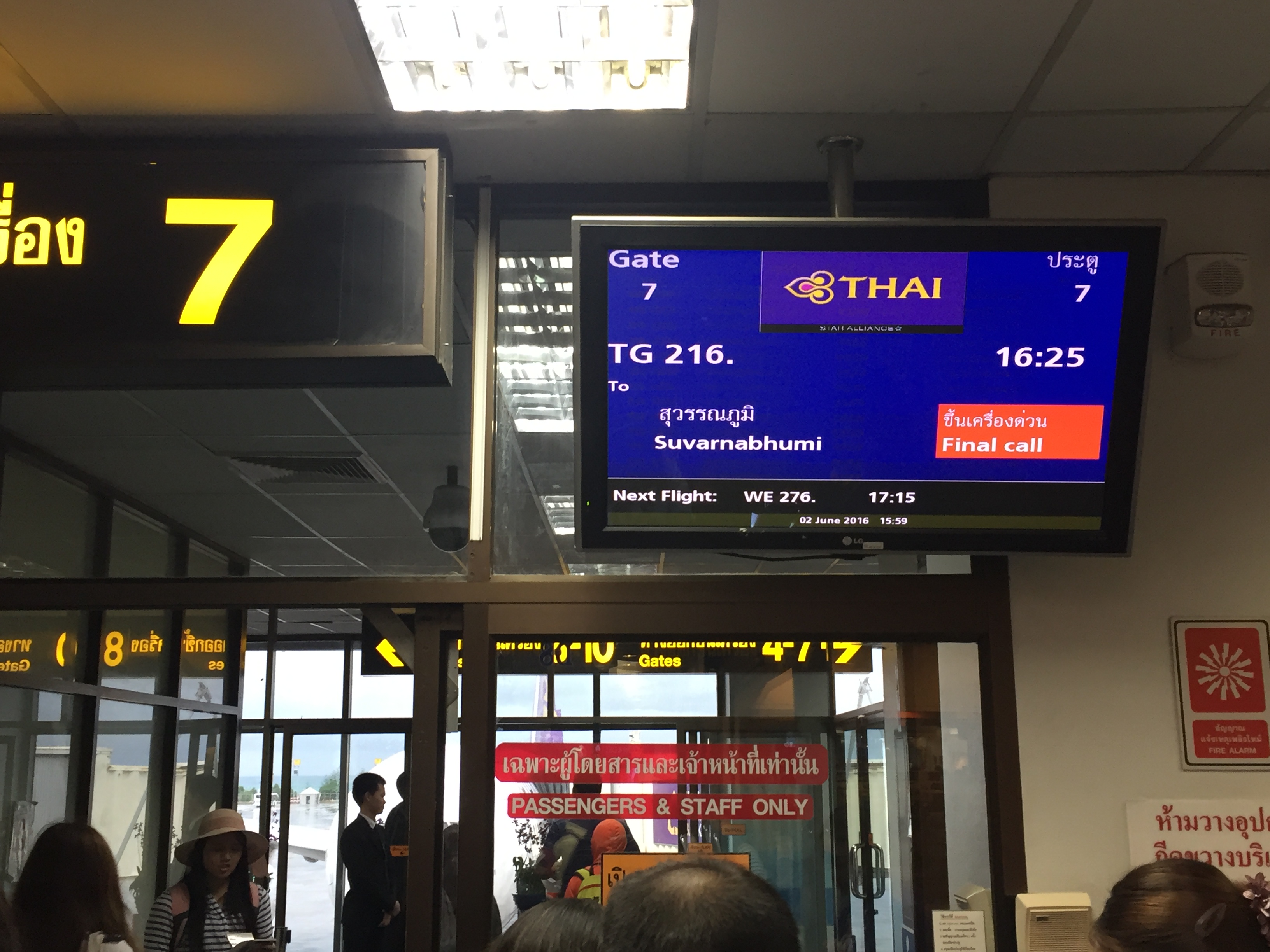 – decidi sair com bastante antecedência, sem dar chance para o azar, pois o trânsito na ilha tinha se mostrado ser imprevisível durante os passeios que fiz; agendei o transporte para 13:10h e cheguei um pouco depois de 14:00h no aeroporto, ou seja, com folga para o voo com partida marcada para 16:25h (TG216)