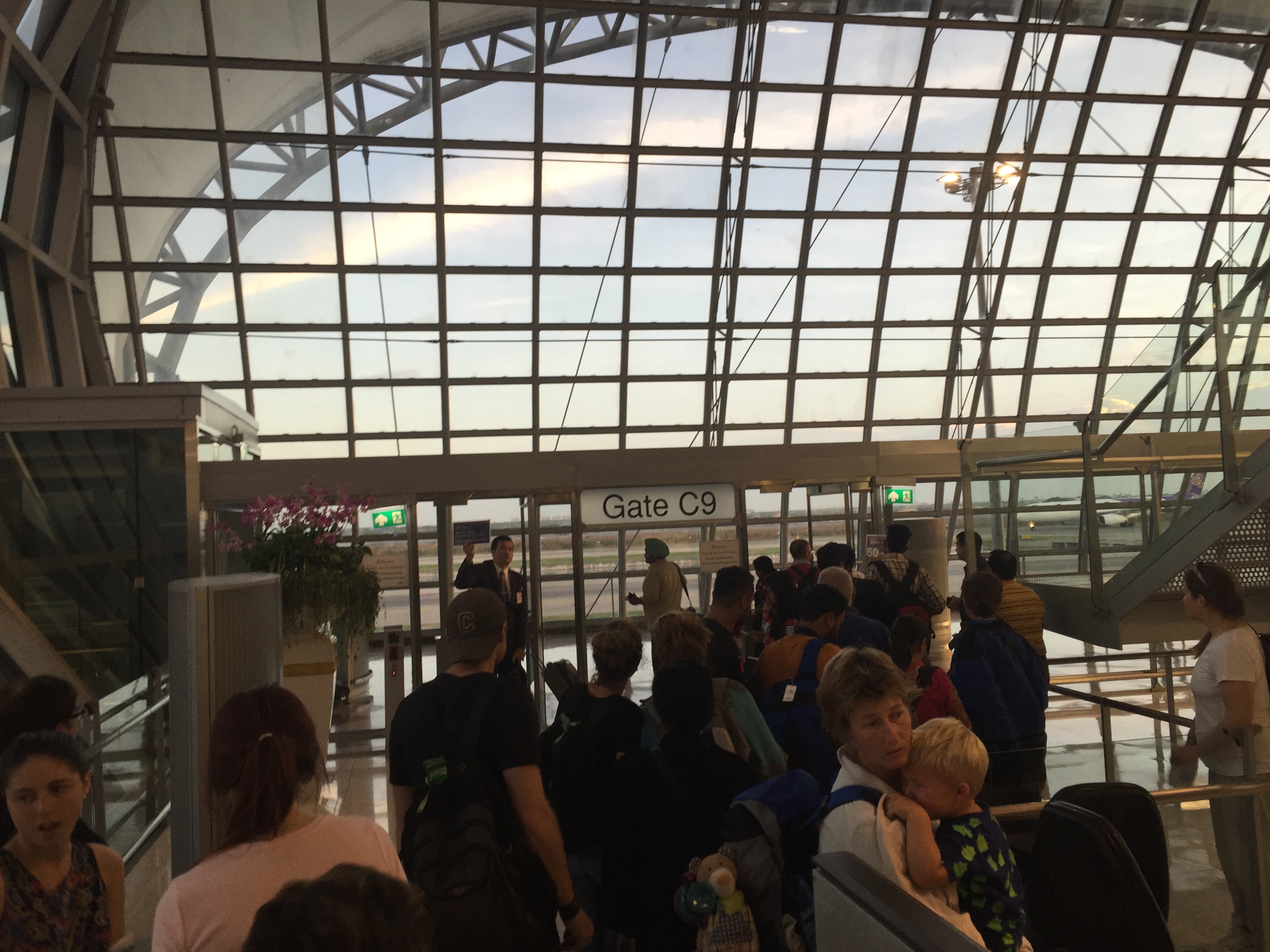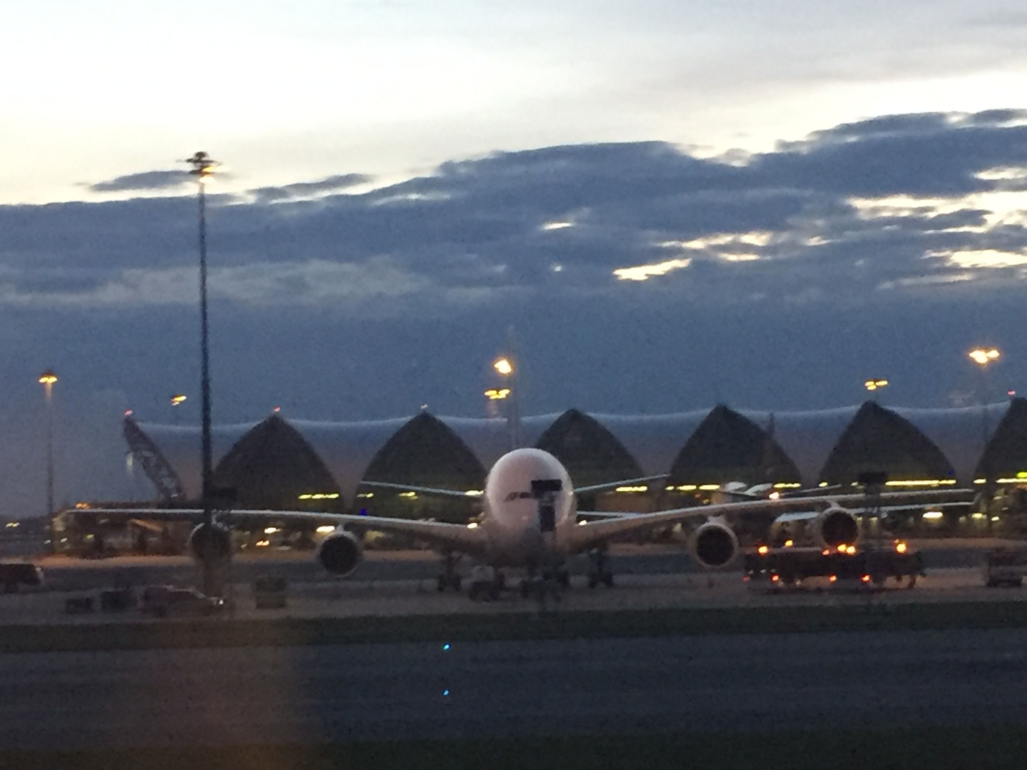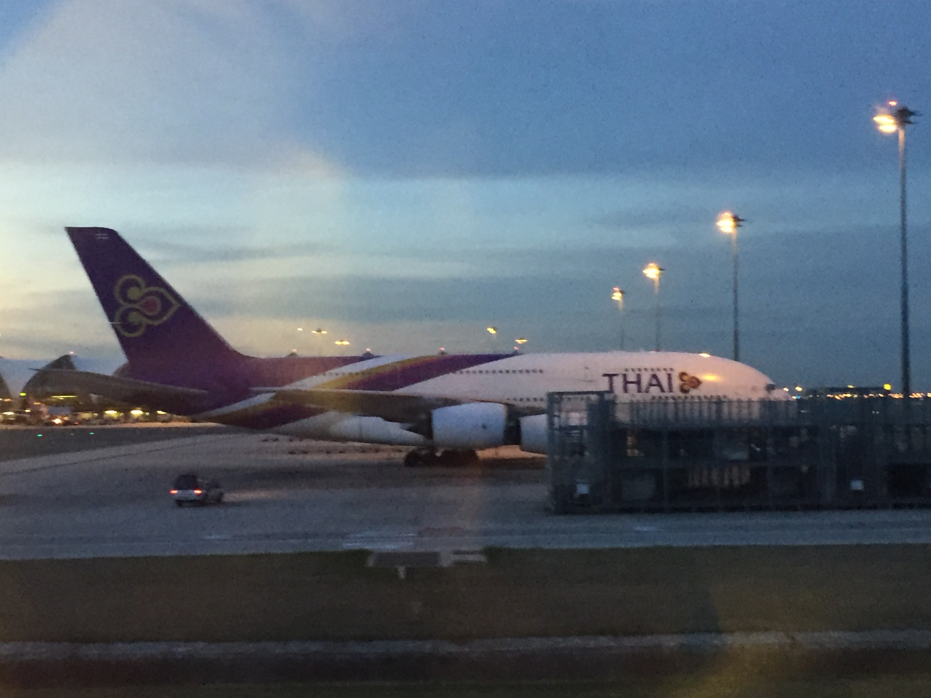 – pousamos em Bangkok às 17:44h e depois de passar por vários aviões wide-bodies da THAI estacionados a espera da próxima missão, encostamos no portão às 17:55h, portanto, não podia perder muito tempo para não correr risco de perder o voo para Auckland que estava marcado para 18:45h