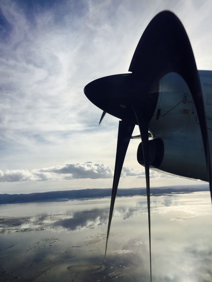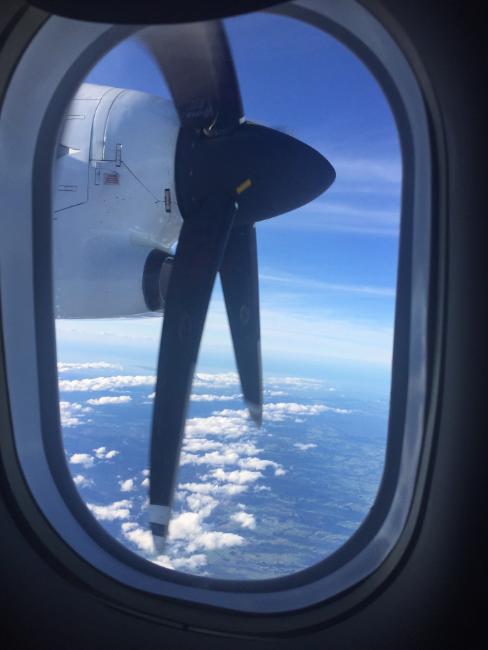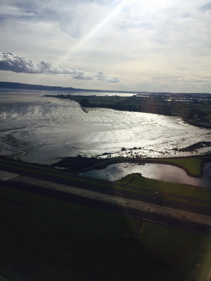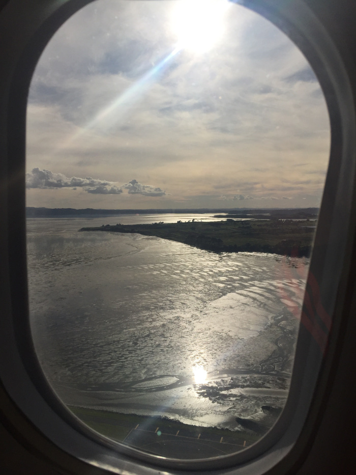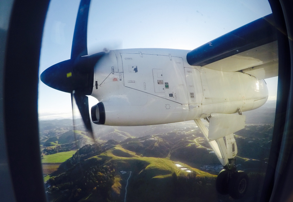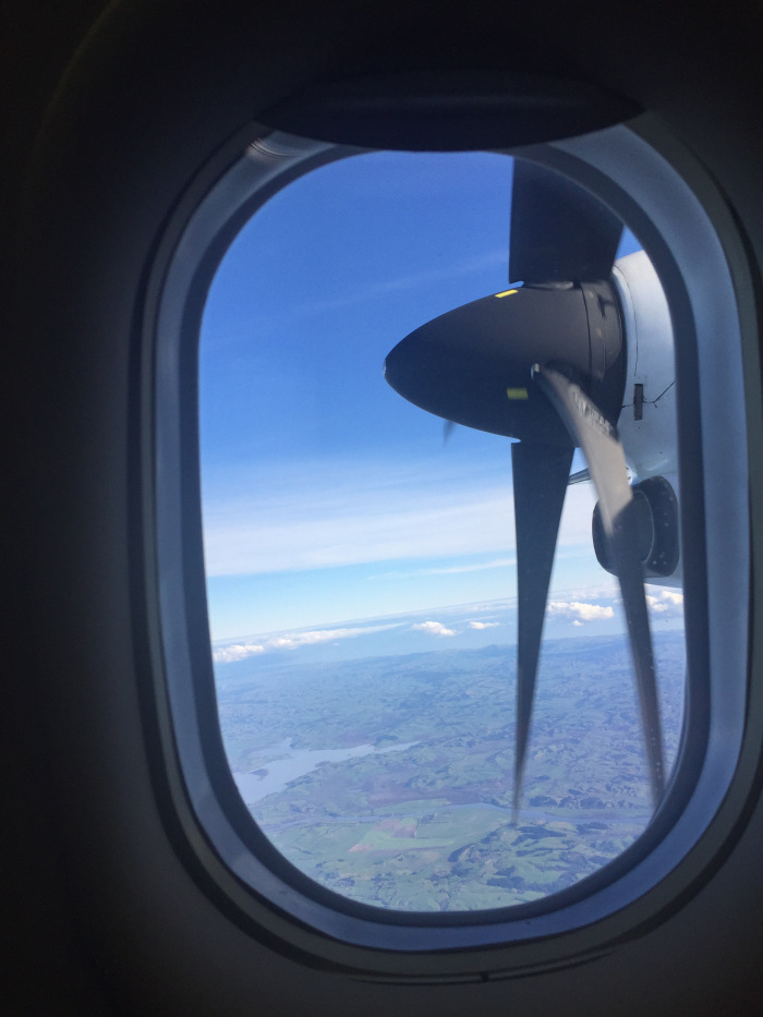 – a decolagem foi iniciada às 14:32h, o Q300 demorou apenas 24 segundos para começar a ganhar altitude; os arredores do Aeroporto de Auckland trazem paisagens lindas, com o sol forte batendo na minha janela; o barulho que o Bombardier faz quando as hélices estão em potência máxima me pareceu maior do que o produzido pelo ATR-72