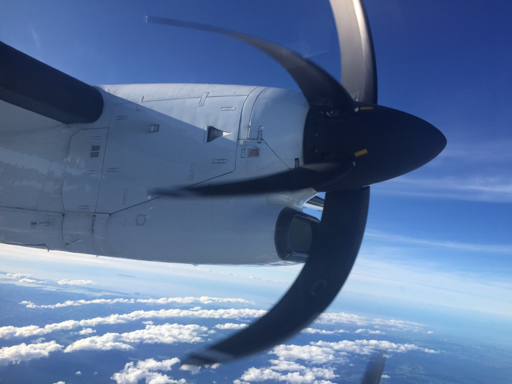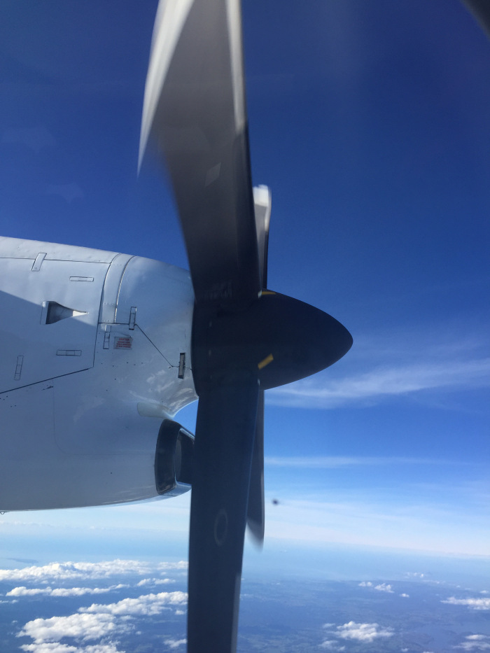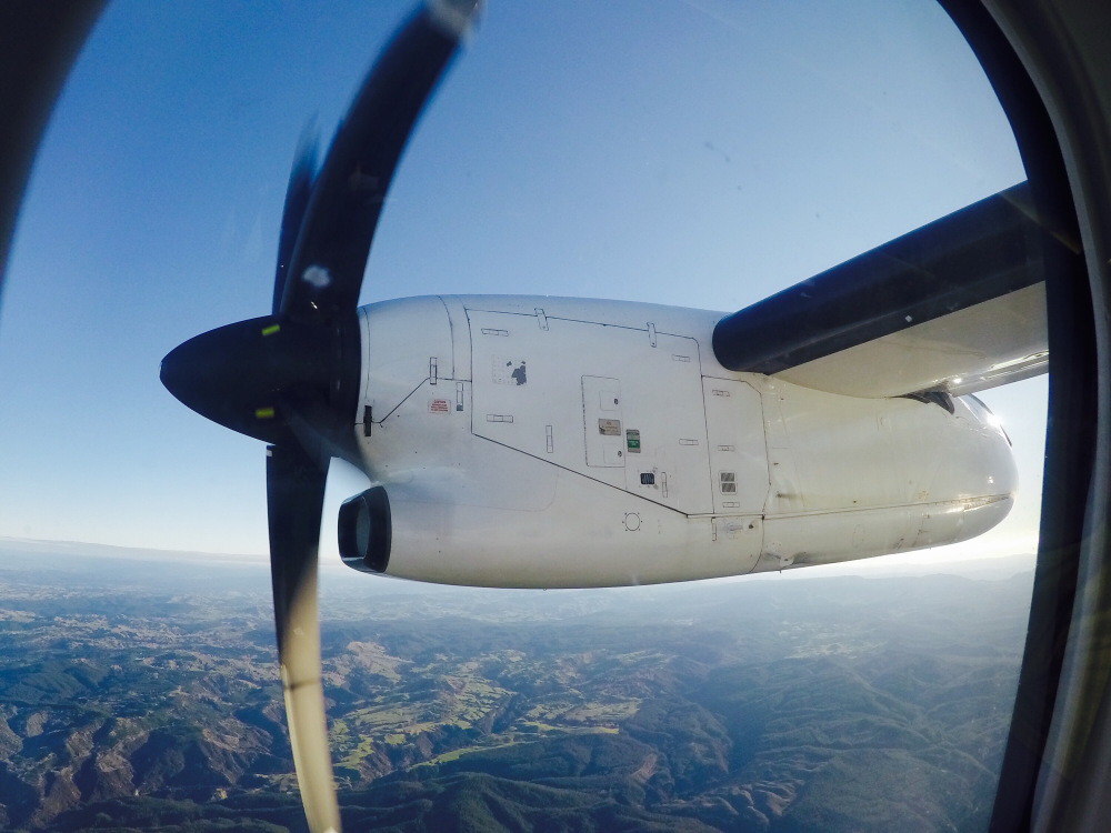 – como eu era o único passageiro na minha fileira (não havia ninguem ao meu lado, nem do outro lado do avião), foi fácil tirar fotos das 02 hélices do Q300 a partir da janela de ambos os lados