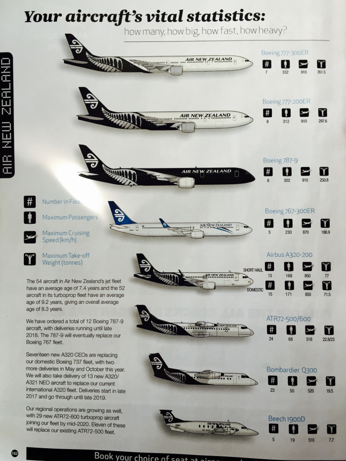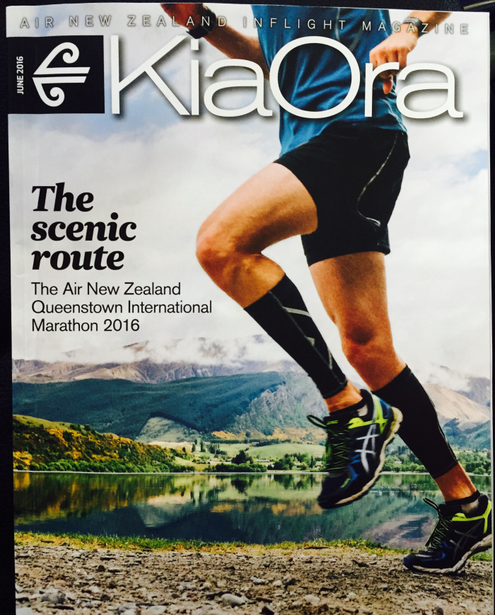 – neste pequeno avião regional não há sistema de vídeo (individual ou coletivo), mas a Air NZ oferece aos seus clientes uma revista de bordo de nome “KiaOra”; gostei do conteúdo, traz reportagens de temas culturais e turismo; a capa promovia a Air New Zealand International Marathon 2016, que será realizada em novembro deste ano; além disso, há informações detalhadas da frota da Air NZ