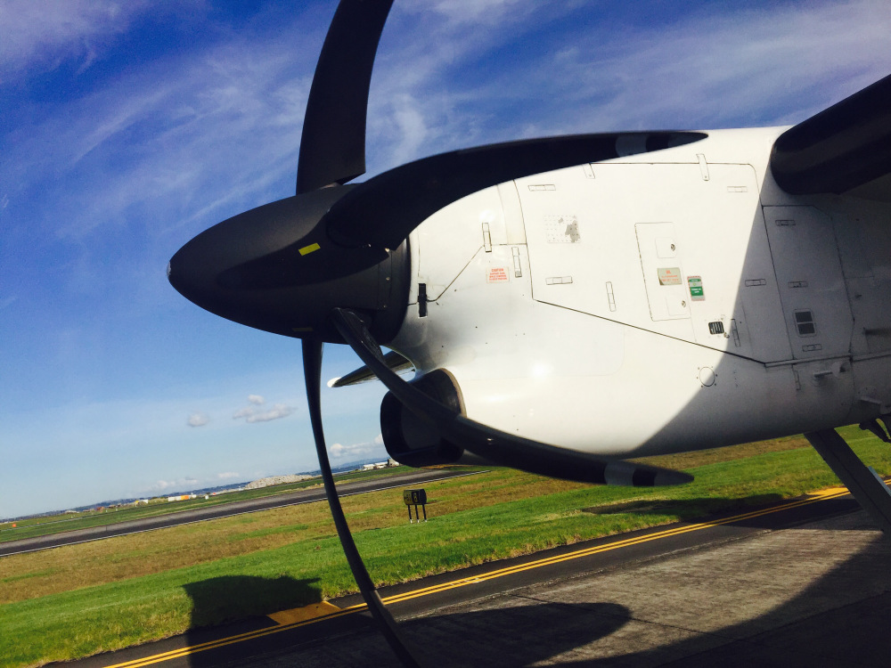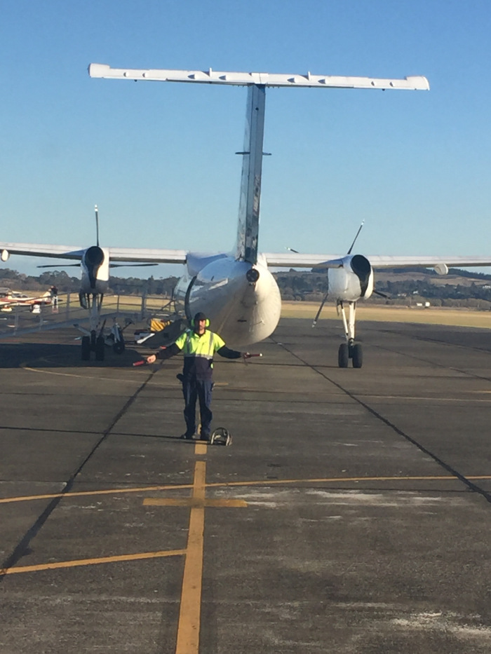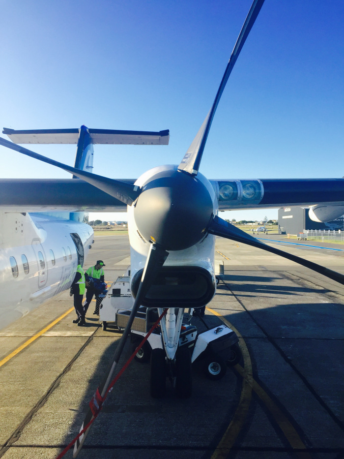 – na caminhada até o meu portão, foi possível tirar fotos de outras aeronaves que estavam sendo preparadas para o próximo voo; consegui registrar os detalhes de um Bombardier Q300, o mesmo modelo de turbo-hélice que me levaria até Napier