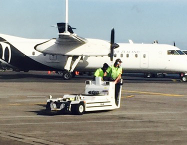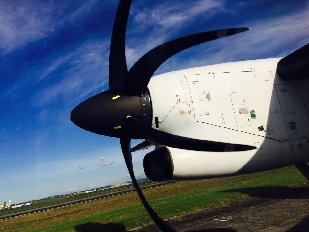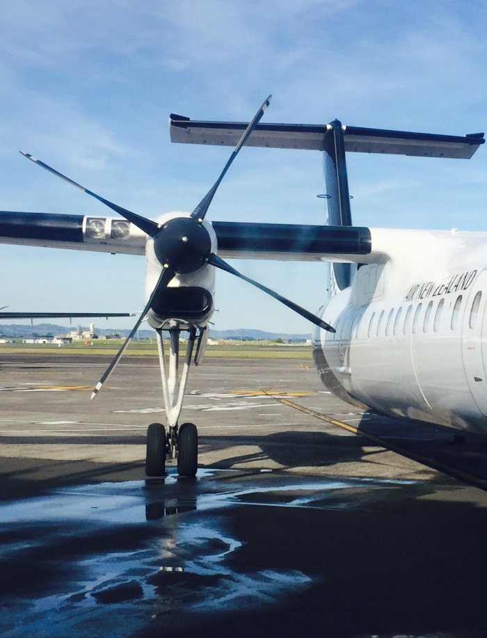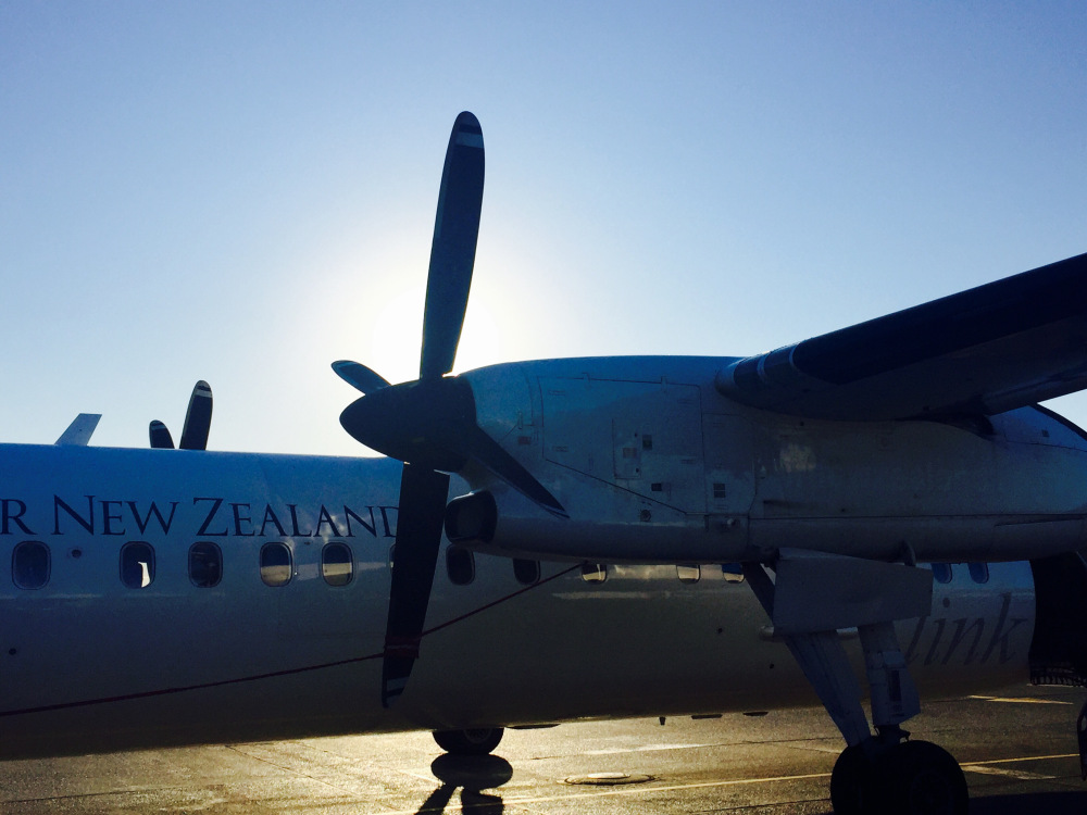 – a Air NZ coloca uma rampa para que os passageiros saiam do avião sem precisar descer os degraus de escada; o sol batia forte bem atrás da aeronave, era uma boa oportunidade para tirar fotos deste avião com linhas únicas; os motores tem apenas 04 hélices e permitem que a velocidade de cruzeiro alcance 500 km/h
