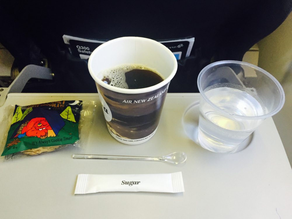 – logo depois que o aviso de apertar cintos foi apagado, Rachelle começou sua missão de servir os passageiros; ela se mostrou extremamente atenciosa e educada; o serviço é simples, mas “honesto”: um copo de água, um pacotinho de cookies e café (ou chá) e, por fim, umas balinhas estilizadas ao final
