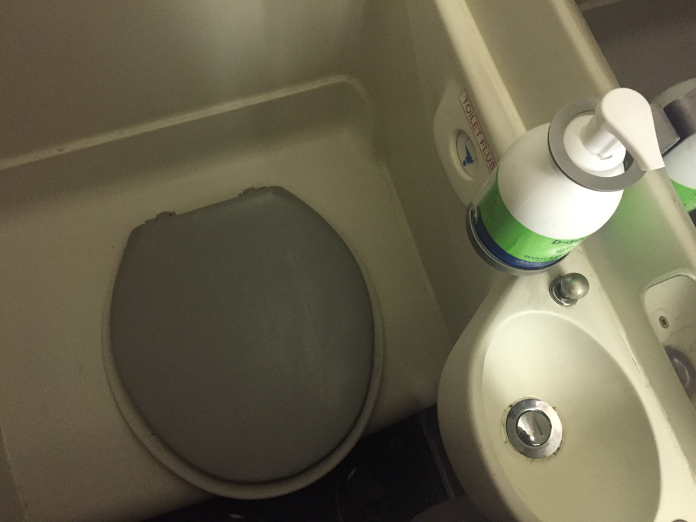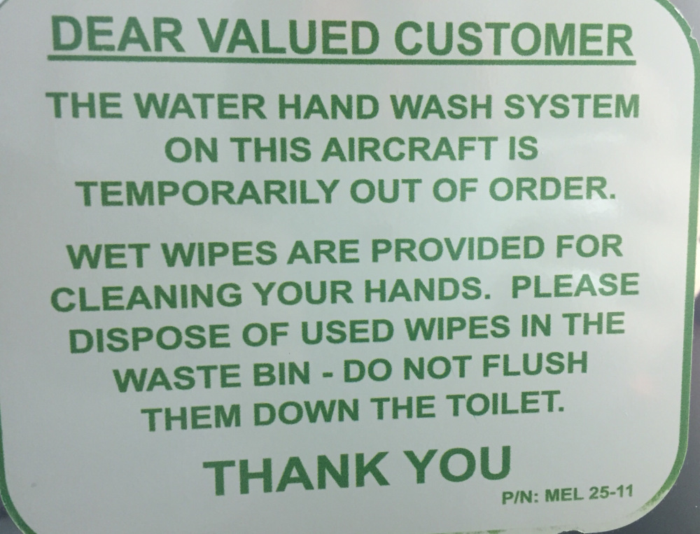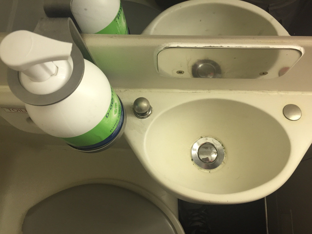 – o Q300 tem apenas 01 banheiro, instalado na parte da frente, ao lado da pequena galley; como o voo estava tranquilo, fui lá conferir: é muito pequeno e o sistema de água estava com problemas, de acordo com um alerta colocado ao lado da pia