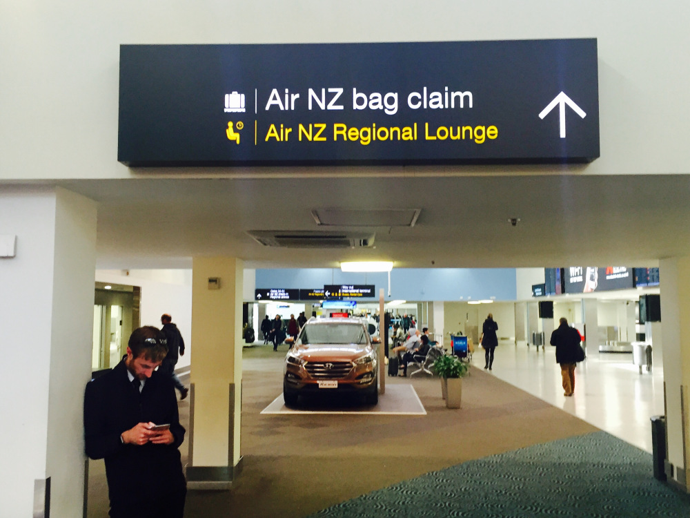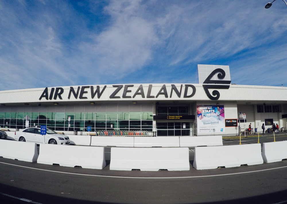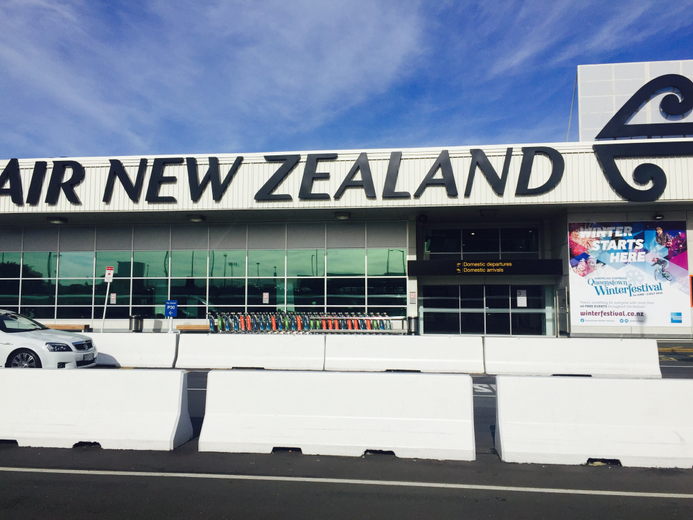 – por fora do terminal, um grande letreiro com a logomarca da Air NZ indica que se trata de uma estrutura dedicada para a companhia aérea; a fachada do aeroporto é modesta, com um único pavimento
