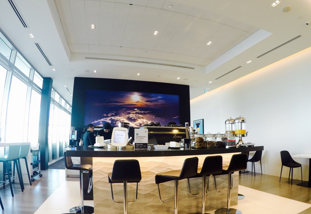 – o espaço era pequeno, mas extremamente acolhedor e completo, com móveis novos e funcionários de bom humor; são 02 salões: um deles onde estão o bar, o buffet e mesas/cadeiras e outro com poltronas e bancos maiores, onde um grande monitor com informações sobre os voos que partiriam nas próximas horas; cerca de 10 pessoas compartilhavam o ambiente comigo