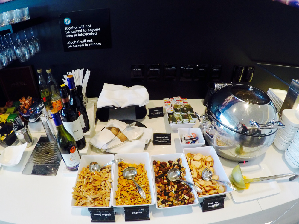 – a Air NZ oferece nesta VIP Lounge muitas opções de bebida (variedade de vinhos, licores, cervejas sucos, refrigerantes e café) e comida (snacks, sanduíches diversos, sopa, queijos, frutas e doces); foi providencial, afinal, eu não tinha almoçado, comi um lanche gostoso que espantou a fome e tomei uma taça de vinho nacional, de ótima qualidade