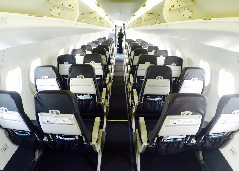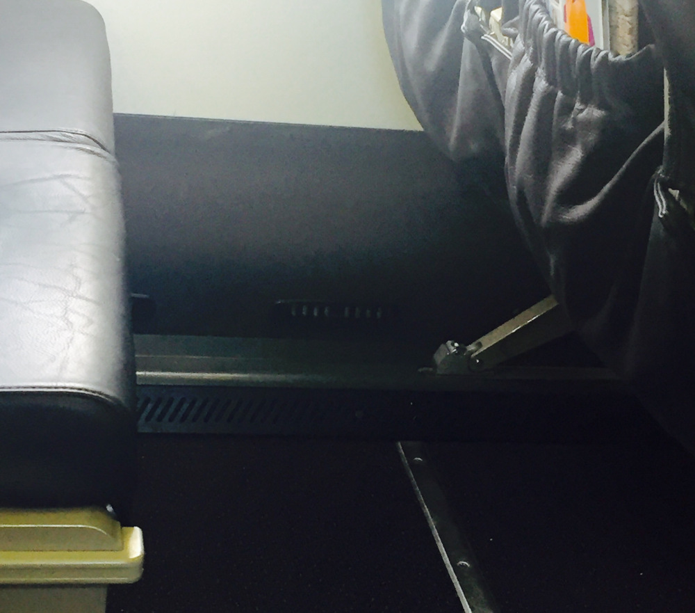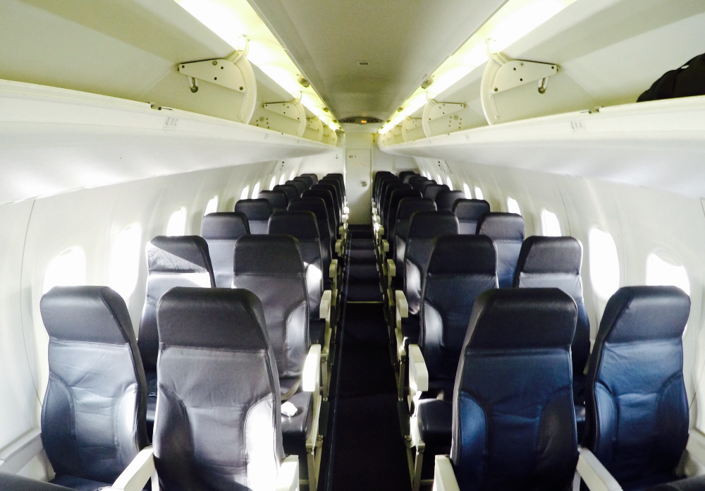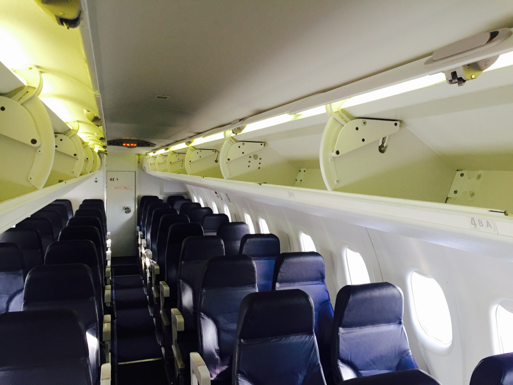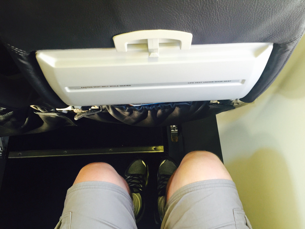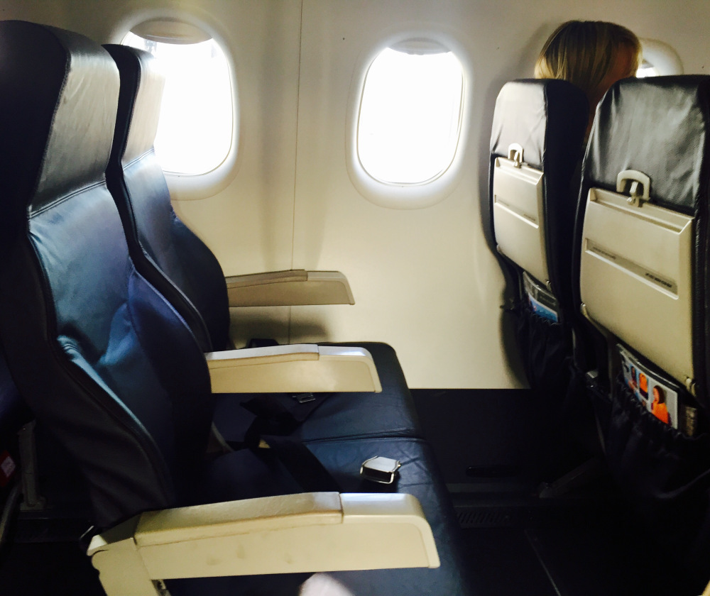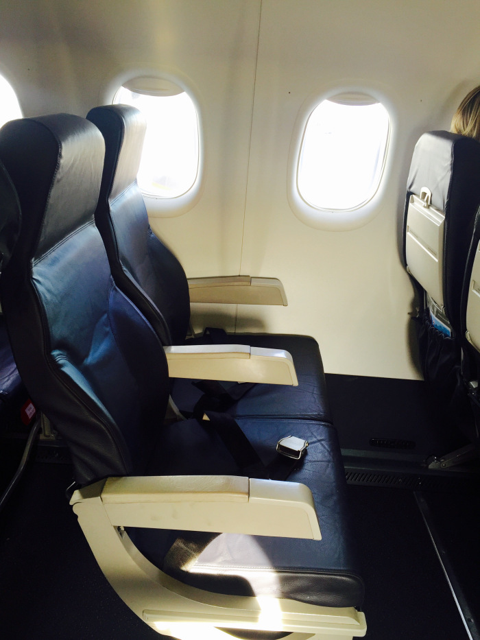 – os bancos do Q300 eram de couro azul escuro e a distância entre as poltronas trazia bom espaço para as pernas; mas para quem senta na janela há um detalhe importante: a perna que fica perto da “parede” do avião fica apoiada em um pequeno degrau da estrutura inferior do avião, portanto, as pernas ficam desniveladas, causando um estranha sensação de desconforto; a minha poltrona era a 3D, uma janela na parte frontal e do lado direito do Q300