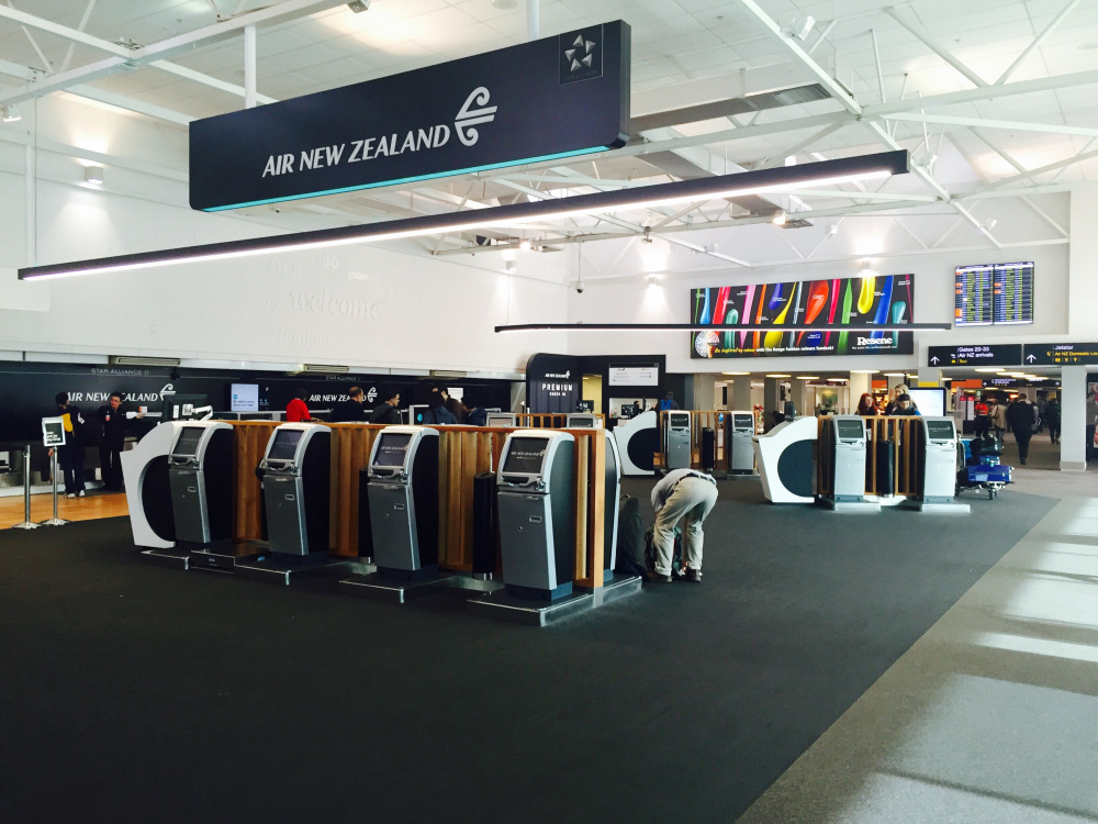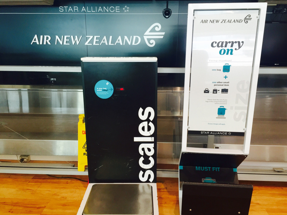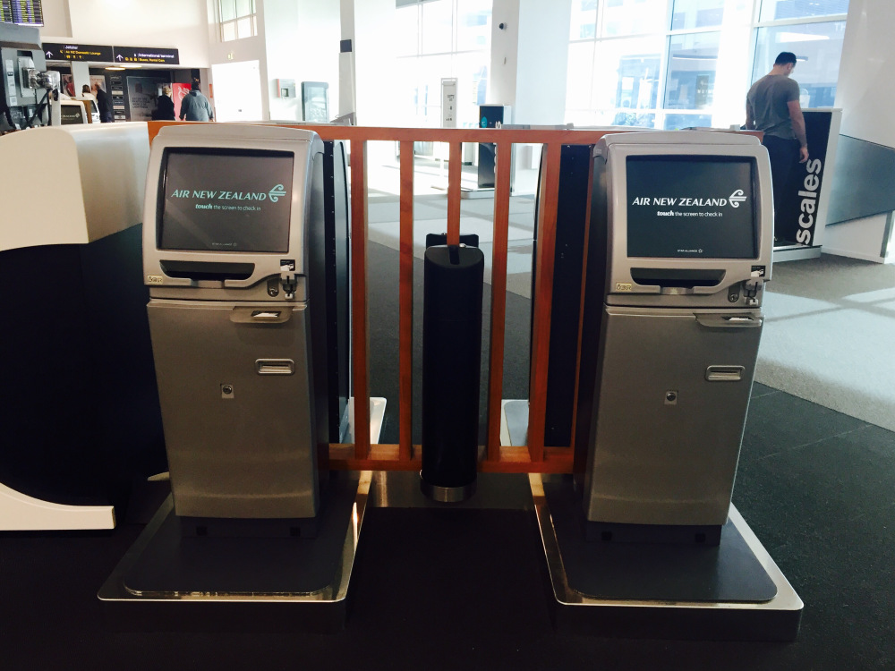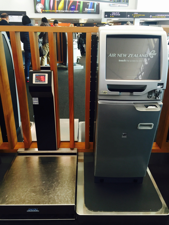 – quando cheguei na área utilizada pela Air NZ, encontrei um salão cheio de máquinas de auto-atendimento: a companhia automatizou todo o processo de check-in dos passageiros, são dezenas de totens e balanças onde os clientes imprimem seu cartão de embarque, pesam as malas que vão despachar e imprimem também a etiqueta delas; fiz o meu procedimento muito rapidamente, o sistema é muito didático, informei o número do Programa Amigo da Avianca Brasil, de olho no acúmulo de pontos na companhia aérea brasileira