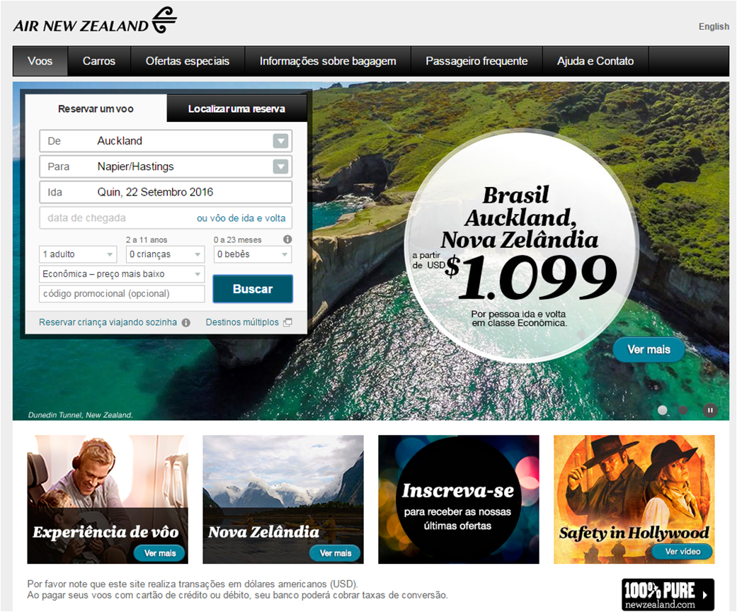 – a Air NZ lançou recentemente uma versão do site em português, pois começou a vender voos para o Brasil (de Auckland para Buenos Aires e de lá para São Paulo ou Rio de Janeiro com este trecho sendo operado pela Turkish Airlines ou Aerolineas Argentinas); mas os preços das passagens para o trecho que voei são muito mais caros! Ao invés dos 59 dólares neozelandeses (cerca de R$ 130,00) da versão “gringa” do site, o preço para venda no Brasil é de 145 dólares norte-americanos (cerca de R$ 450,00)