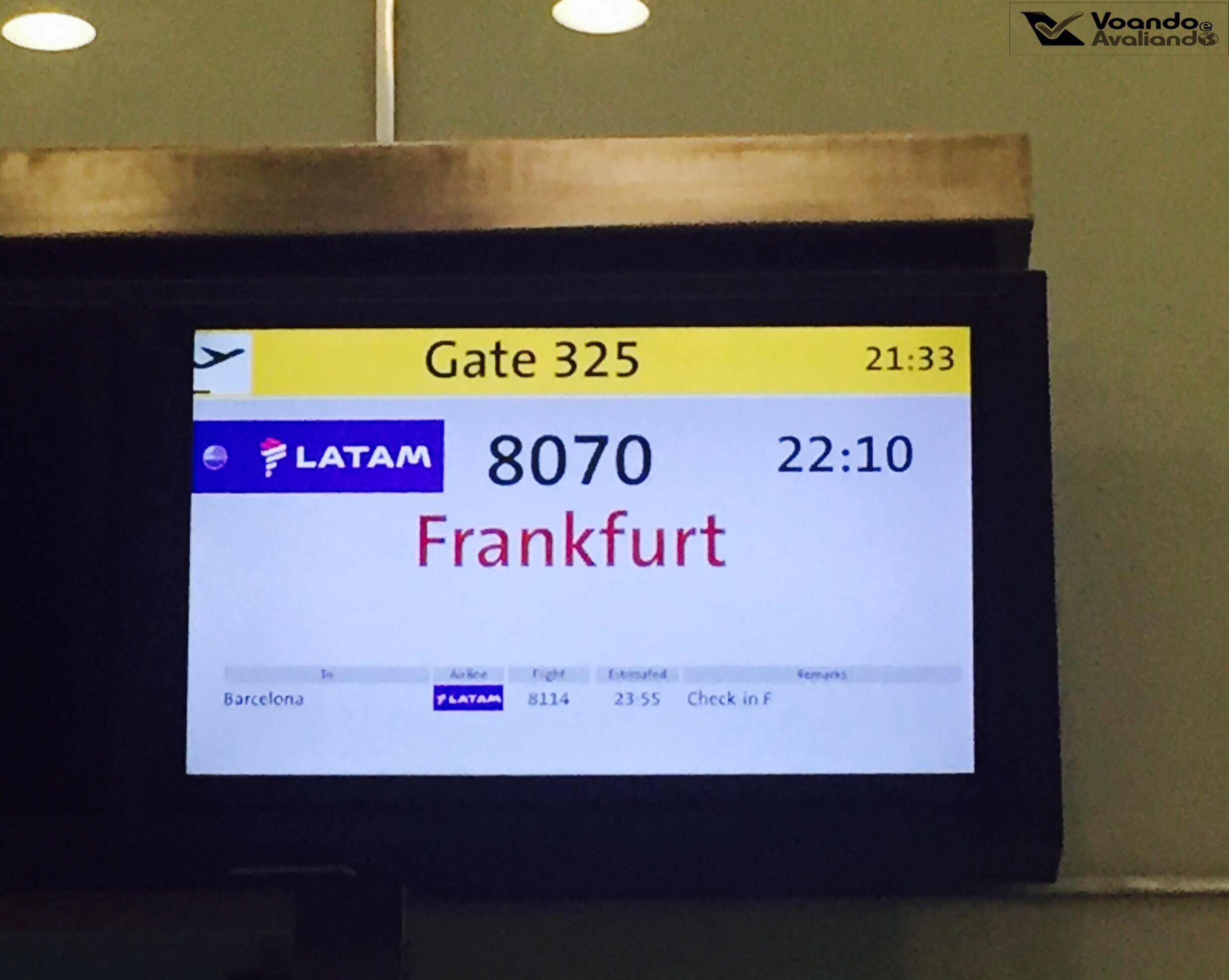 – o anúncio de embarque do voo JJ8070 foi feito pelo sistema de áudio da VIP Lounge às 21:15h (portanto, 55 minutos antes do horário previsto de partida – 22:10h) e logo partimos em direção ao Portão 325; na recepção, perguntamos novamente sobre o upgrade da minha esposa e veio mais uma ótima notícia: tinha sido concedido!!!!