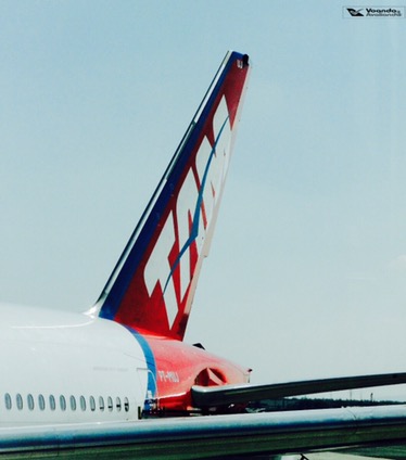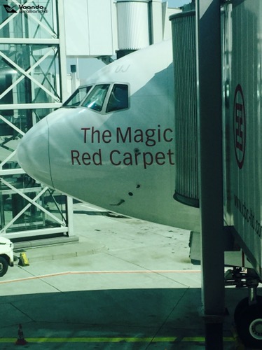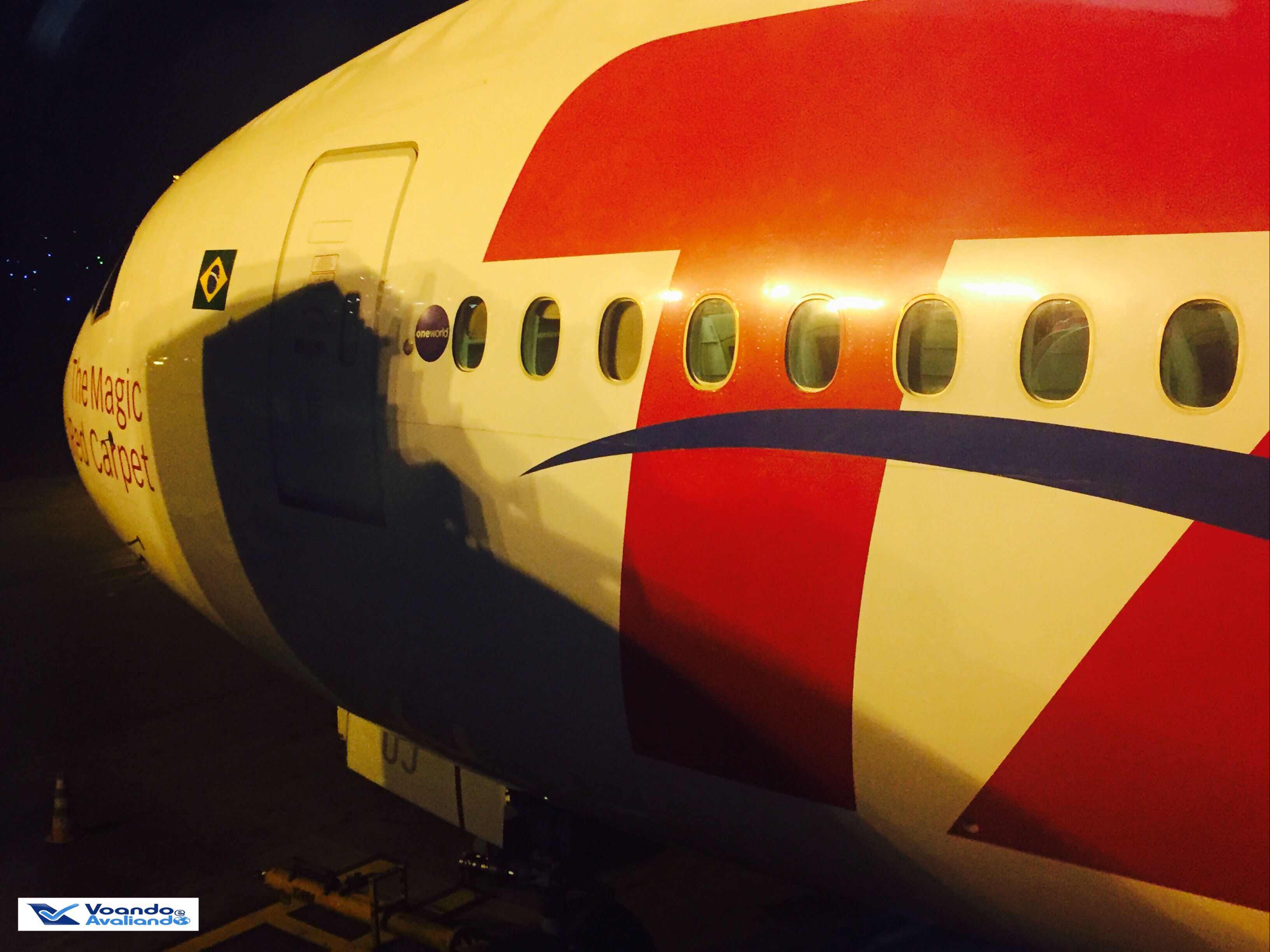 – a ponte que liga o avião ao terminal de passageiros é de vidro e permitia uma ampla e bonita visão do B777, com destaque para o clássico “The Magic Red Carpet” pintado no nariz dele