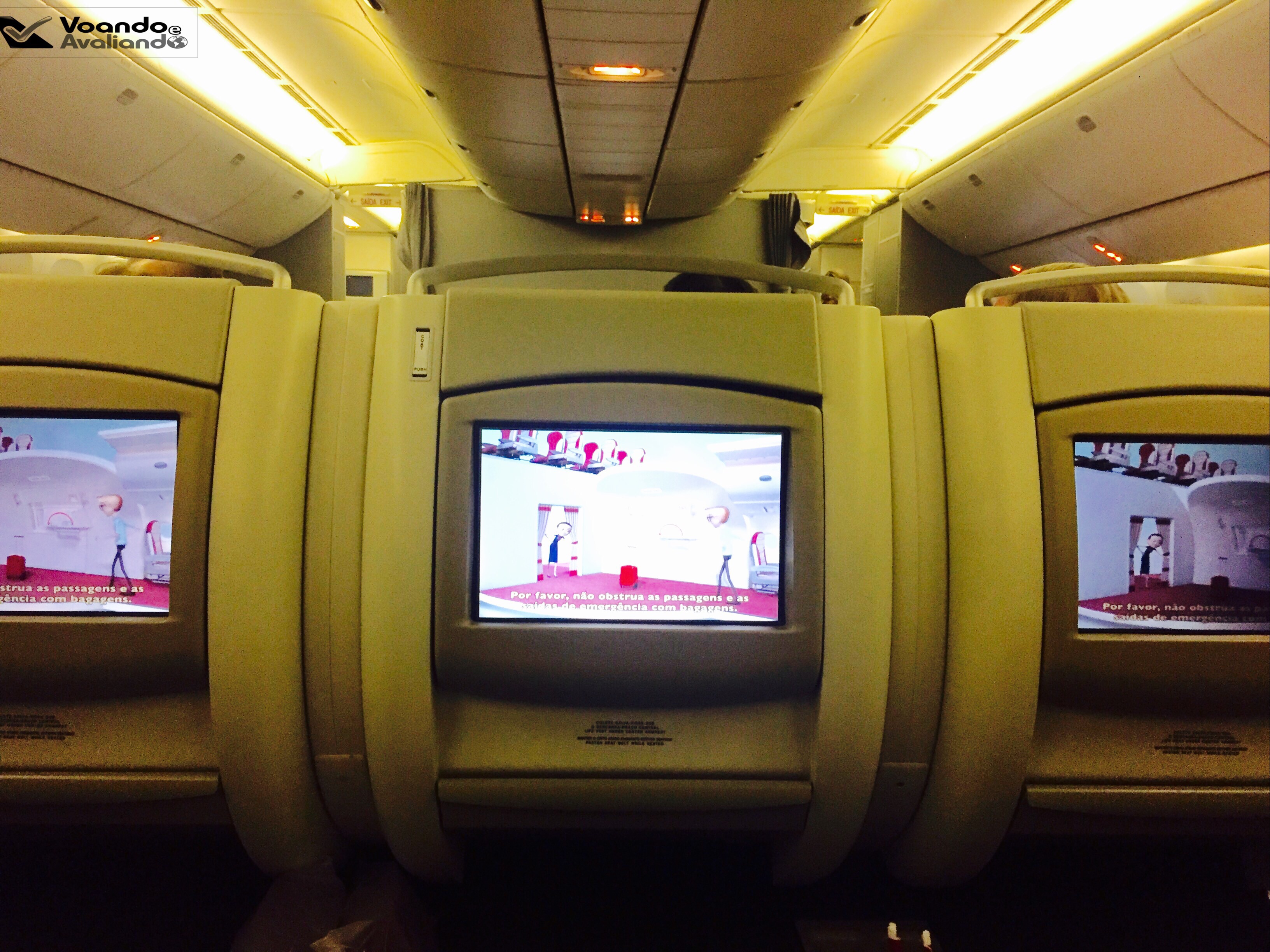 – o gigante de centenas de toneladas que nos levaria até a Alemanha tinha o prefixo PT-MUJ: é o mais novo dos 10 B777s que compoem a frota da LATAM, foi entregue no final de agosto de 2013, pode carregar mais de 360 passageiros, voando a quase 900km/h e está bem conservado pela companhia, que configura a classe Executiva deste modelo com 56 lugares na configuração 2 x 3 x 2 (na Econômica é 3 x 4 x3), ou seja, os passageiros que vão no assento do meio da parte central têm uma posição muito desconfortável, um ponto muito negativo para este esquema de poltronas; neste voo, a cabine premium estava lotada, 100% de ocupação