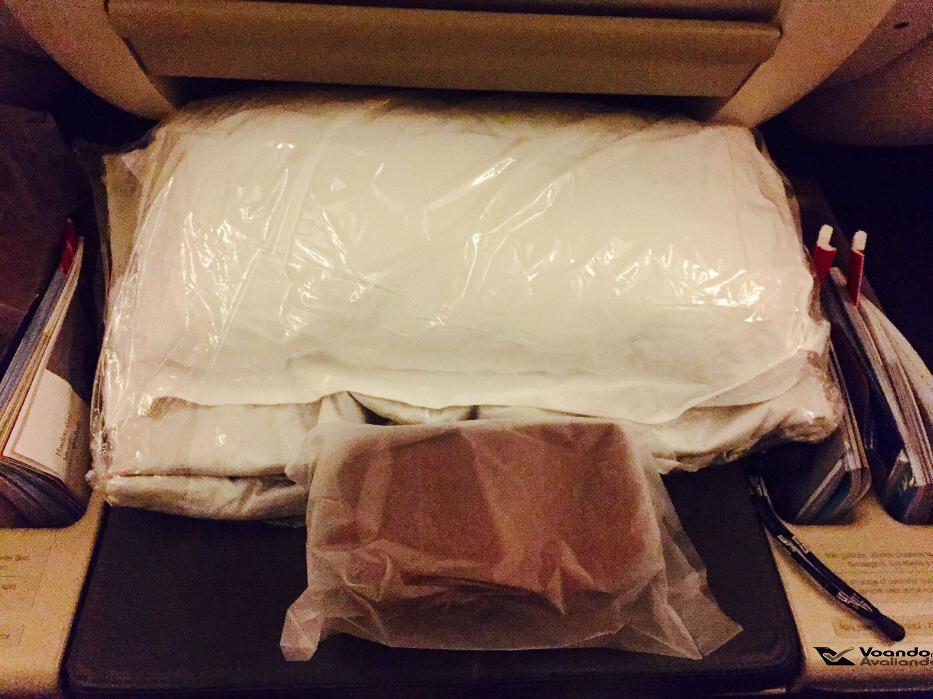 – já sem fome e com o sono começando a aparecer, comecei a ver o 2º filme da viagem: escolhi “Batman vs Superman“, mais um que não vi quando passou nos cinemas; a Comissária me entregou uma garrafinha d’água, providencial caso a sede aparecesse durante a madrugada; no meio do filme, o sono se tornou incontrolável, deu tempo para reclinar a poltrona ao máximo (quase full flat) e dormi, sem me cobrir; acordei algumas horas depois com muito frio, a cabine estava com temperatura muito baixa, tive que recorrer ao cobertor para ficar confortável e voltar a cochilar