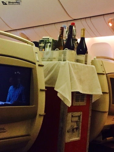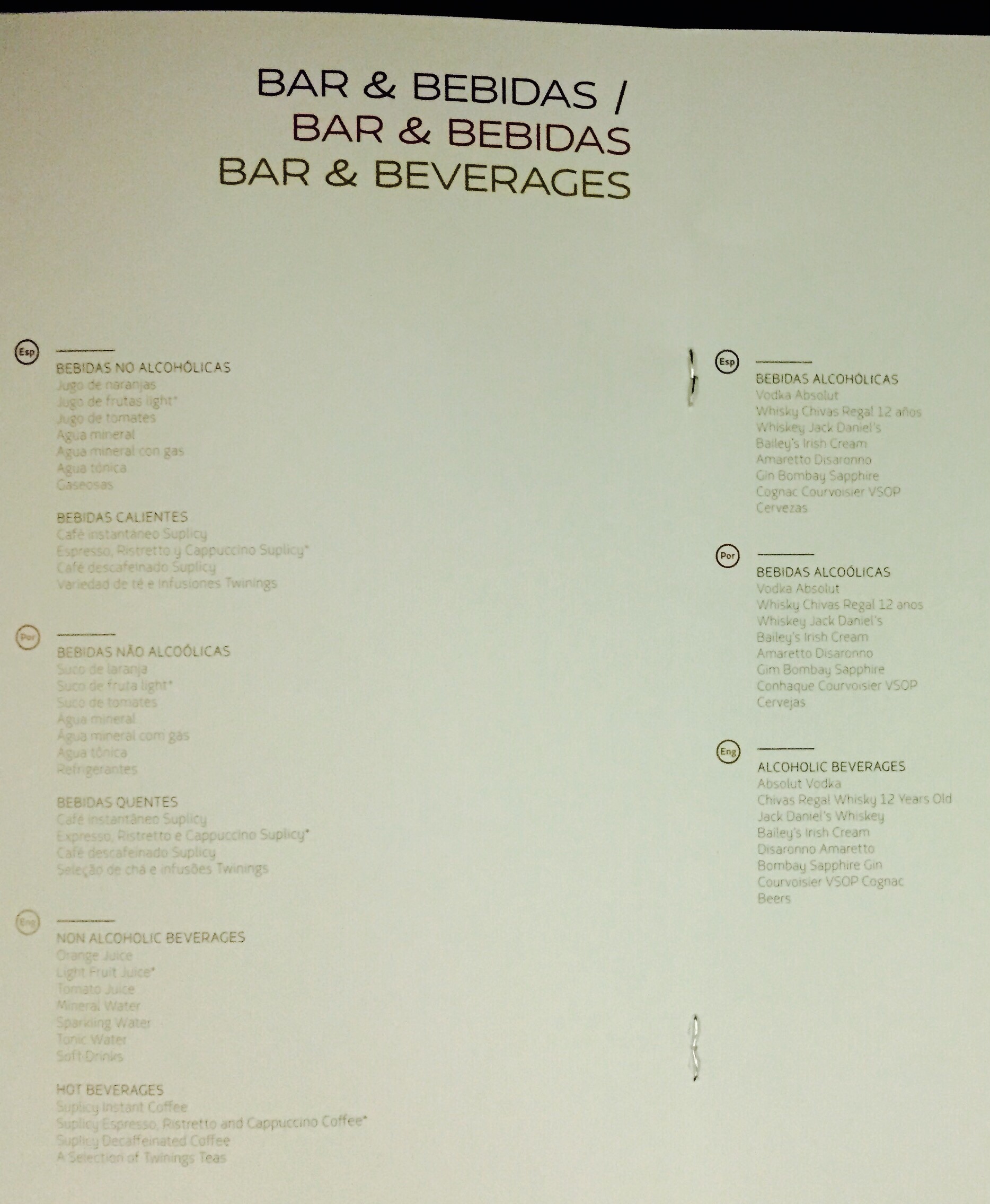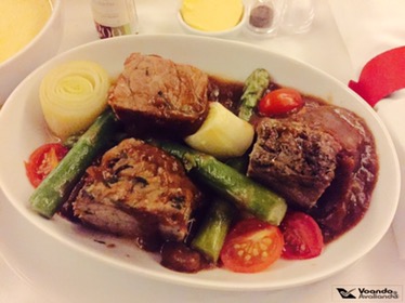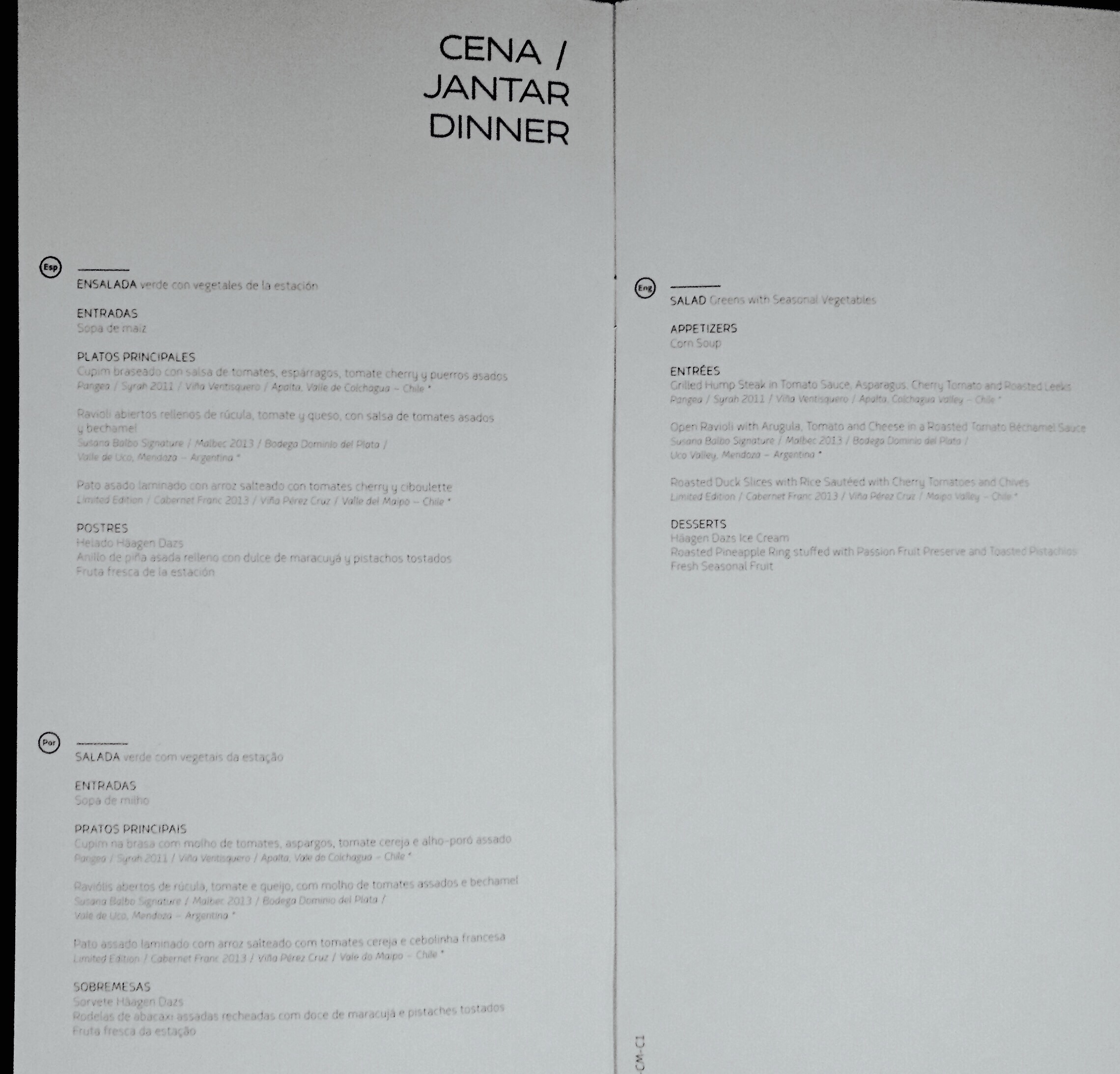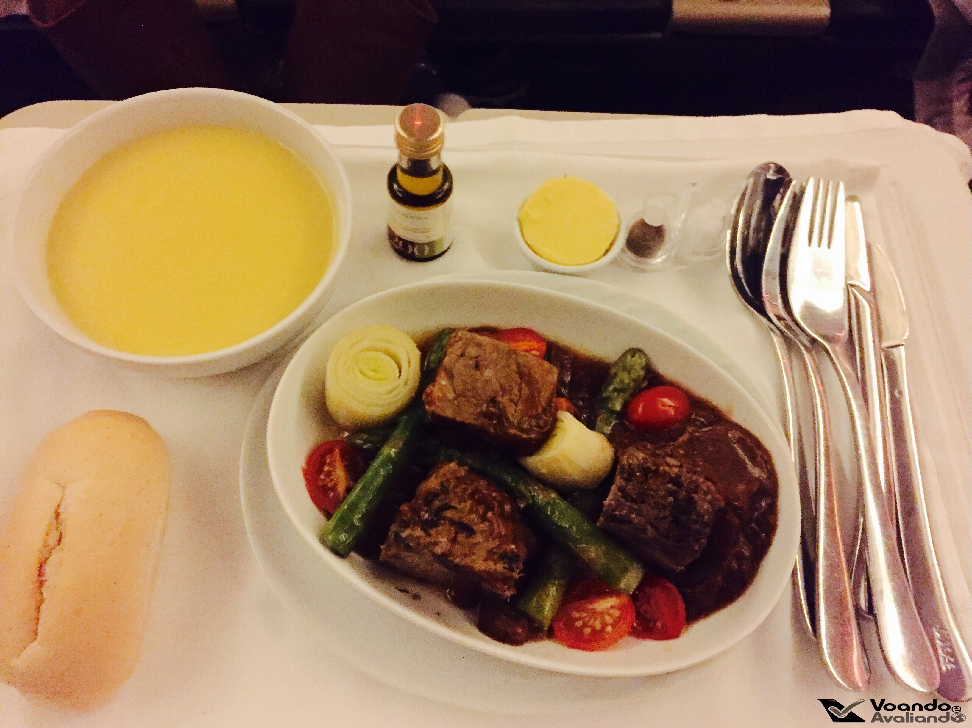– antes das 22:45h, os pedidos de jantar dos passageiros foram anotados pela tripulação; sentar na parte de trás das cabines é sempre um risco: alguns pratos do menu podem não estar mais disponíveis (isto acontece na Econômica e na Executiva); eu chamo isso de “a maldição da última fileira“, que se fez presente neste voo: minha 1ª escolha (pato assado laminado com arroz salteado com tomates cerejas e cebolinha francesa) tinha acabado; só me restou a opção de cupim na brasa com molho de tomates, aspargos, tomate-cereja e alho-poró assado, já que a 3ª alternativa (ravioli aberto de rúcula, tomate e queijo) não me agradou