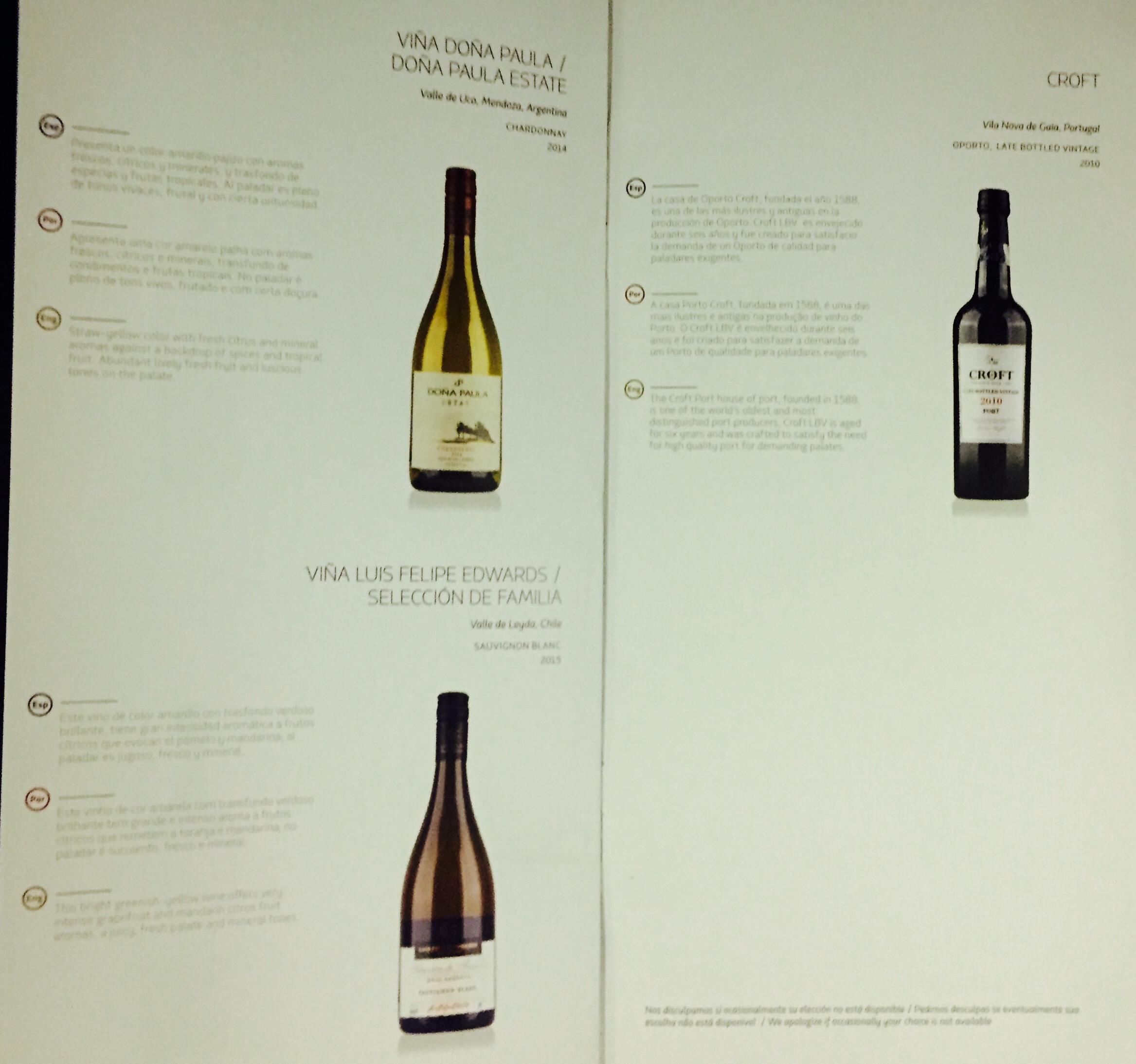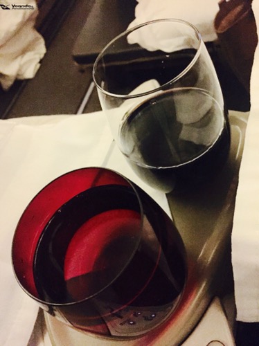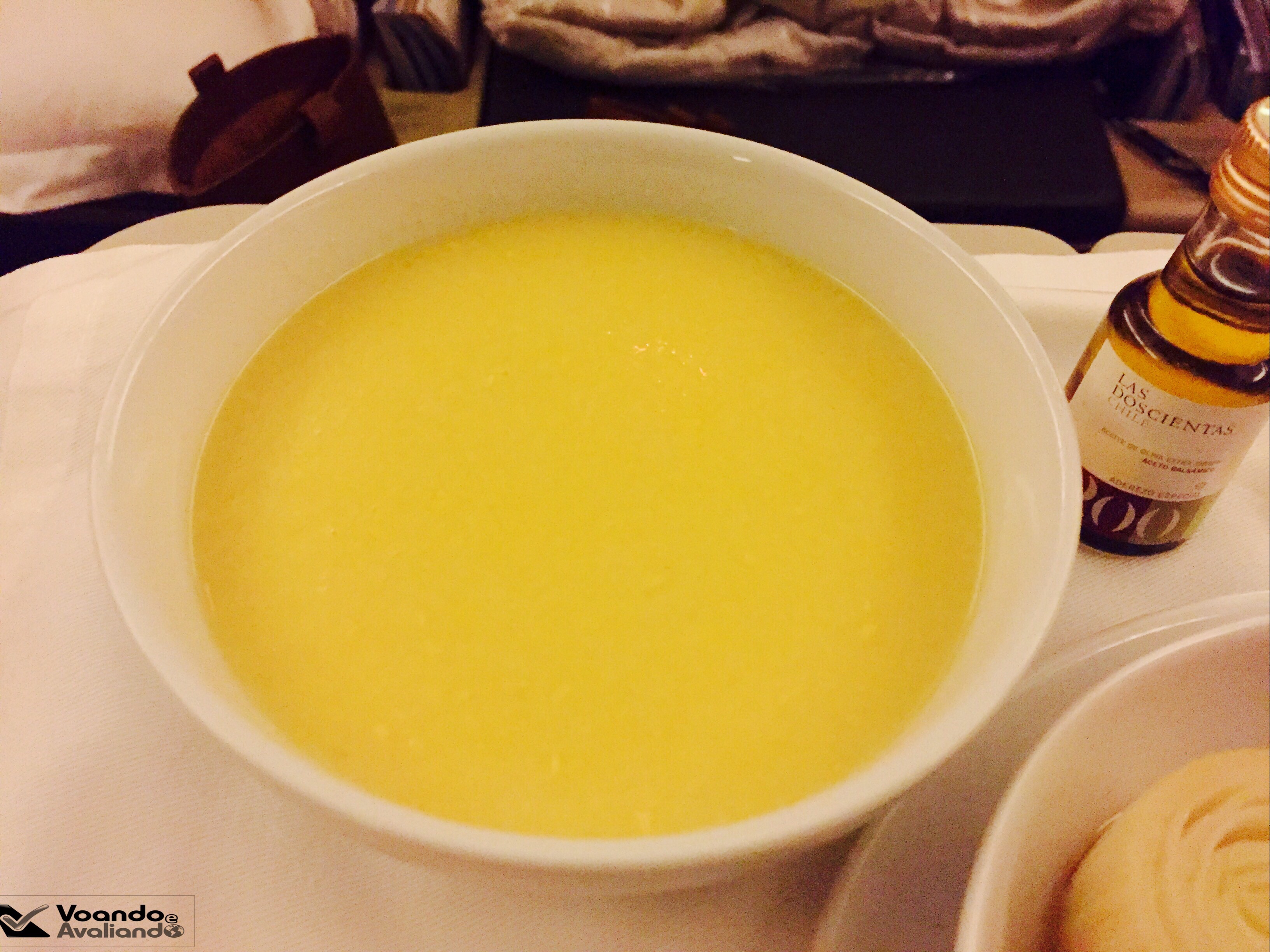 o jantar começou a ser servido às 23:25h (exatamente 01 hora depois da decolagem); a entrada foi uma agradável surpresa (eu dispensei o pratinho de salada): a sopa de milho estava simplesmente deliciosa e o pão que acompanhava estava fresquinho; eu sempre ouvi dizer que a preparação de cupim é complexa, por isso, quando vi esta opção no menu da LATAM pensei: não seria arriscado servir este tipo de carne em avião, onde as condições de preparo são limitadas? O meu receio estava certo: achei a carne dura e muito gordurosa; os legumes que acompanhavam estavam bons; para bebida, escolhi o vinho tinto argentino de Mendonza “Bodega Dominio del Plata” (uva malbec), que estava muito bom, acompanhado de água “com bolhas”