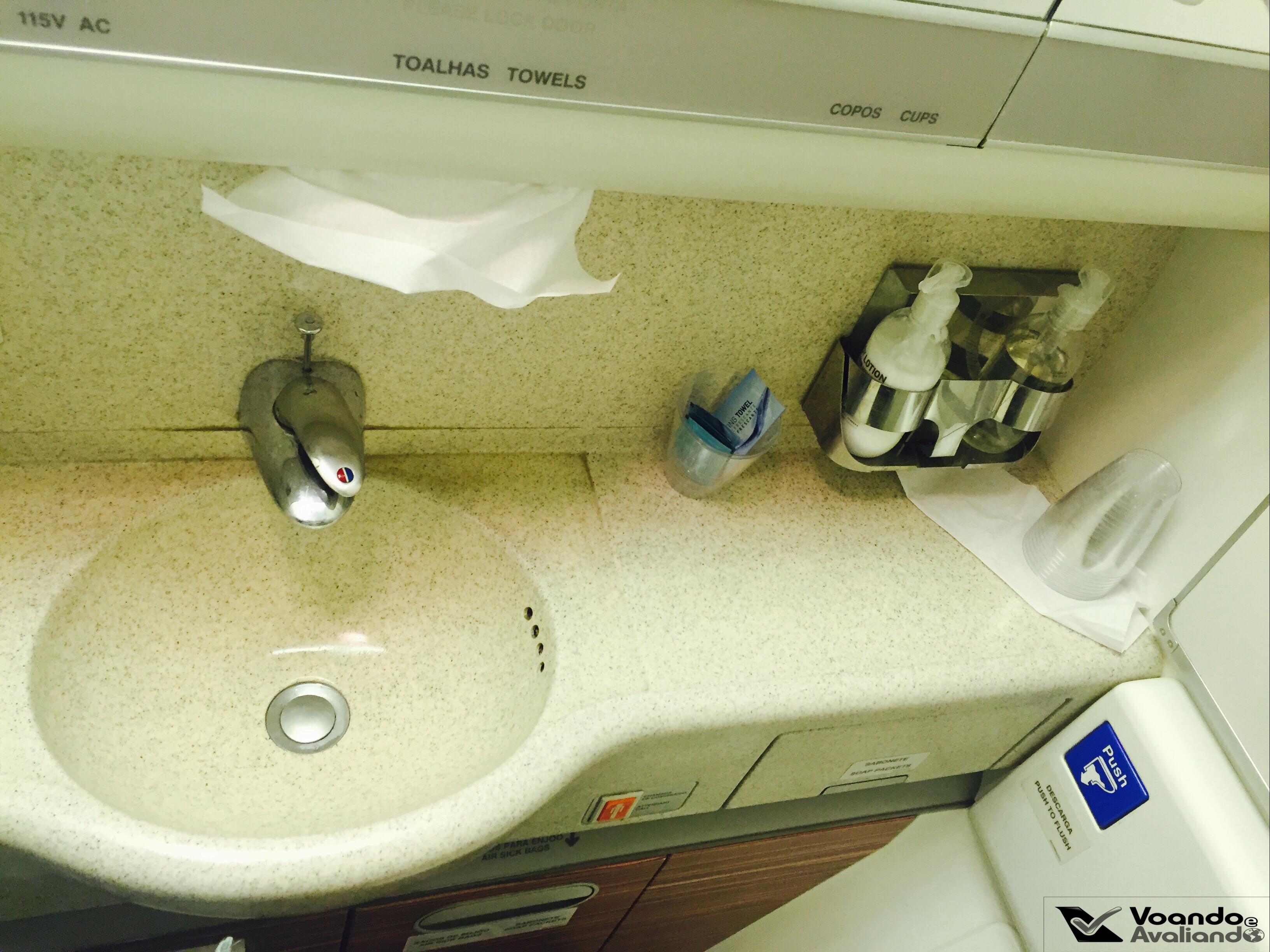 – consegui descansar por cerca de 06 horas e por volta de 07:00h levantei para ir ao banheiro, que tem um bom tamanho, de forma que escovar os dentes não foi um exercício de contorcionismo; ele estava limpo e cheiroso, mas fiquei decepcionado com o seguinte: os lenços umedecidos, que eu tanto gosto, agora não são mais personalizados com a logomarca da companhia, eles são “genéricos” agora