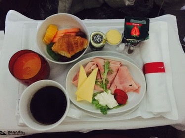 – eram 07:45h quando as Comissárias começaram a despertar os passageiros para o café da manhã (a tripulação pergunta depois do jantar se queremos ser acordados para a refeição matinal); neste momento, ainda faltavam 01:50h para o pouso em Frankfurt; o café foi efetivamente servido somente às 08:15h e foi uma boa experiência: tudo estava fresco e gostoso, o sabor do café preto me surpreendeu, estava ótimo