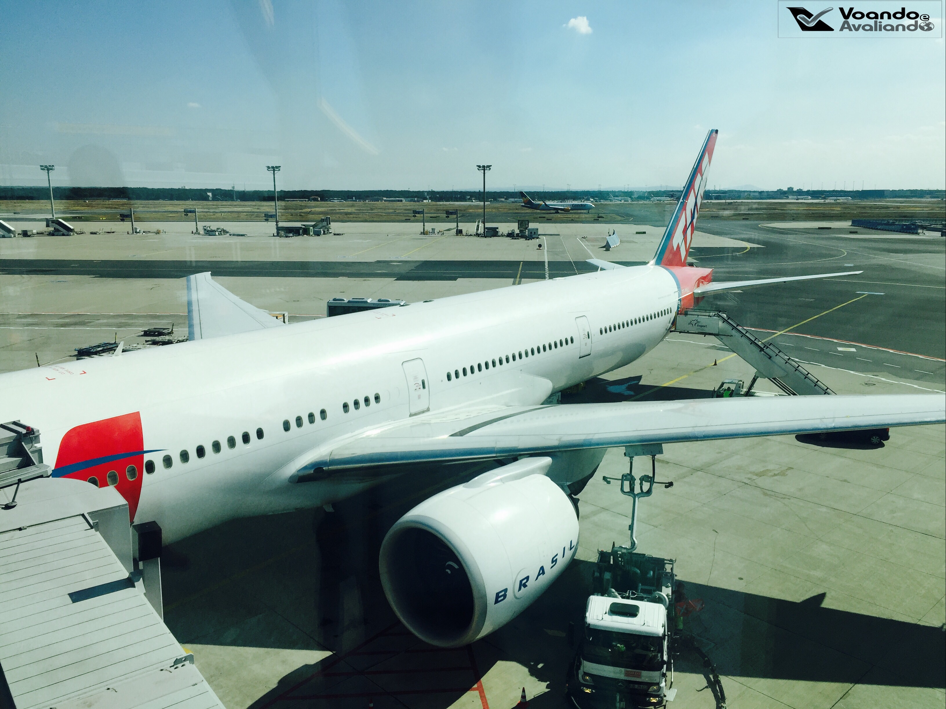 – o gigante de centenas de toneladas que nos levaria até a Alemanha tinha o prefixo PT-MUJ: é o mais novo dos 10 B777s que compoem a frota da LATAM, foi entregue no final de agosto de 2013, pode carregar mais de 360 passageiros, voando a quase 900km/h e está bem conservado pela companhia, que configura a classe Executiva deste modelo com 56 lugares na configuração 2 x 3 x 2 (na Econômica é 3 x 4 x3), ou seja, os passageiros que vão no assento do meio da parte central têm uma posição muito desconfortável, um ponto muito negativo para este esquema de poltronas; neste voo, a cabine premium estava lotada, 100% de ocupação