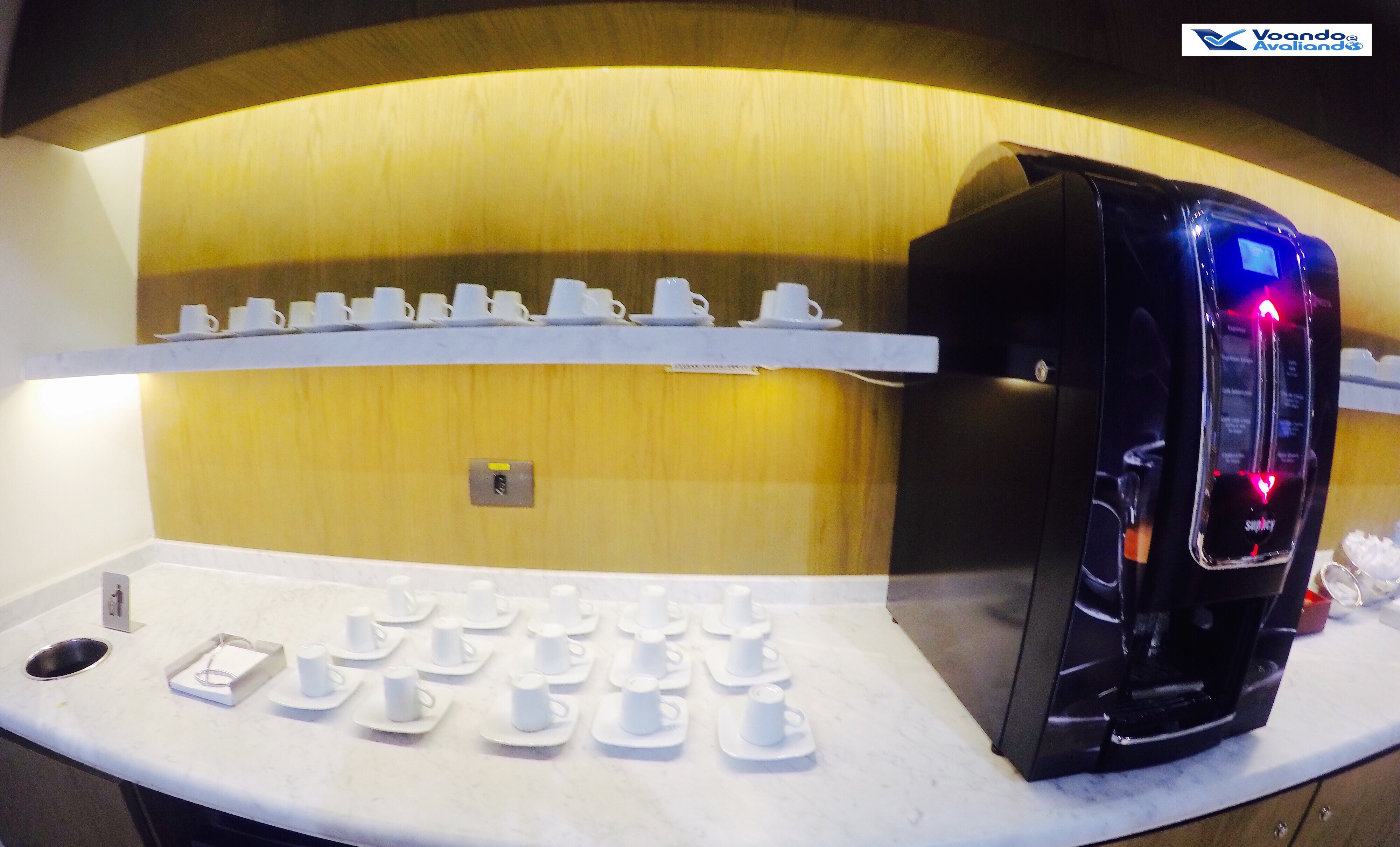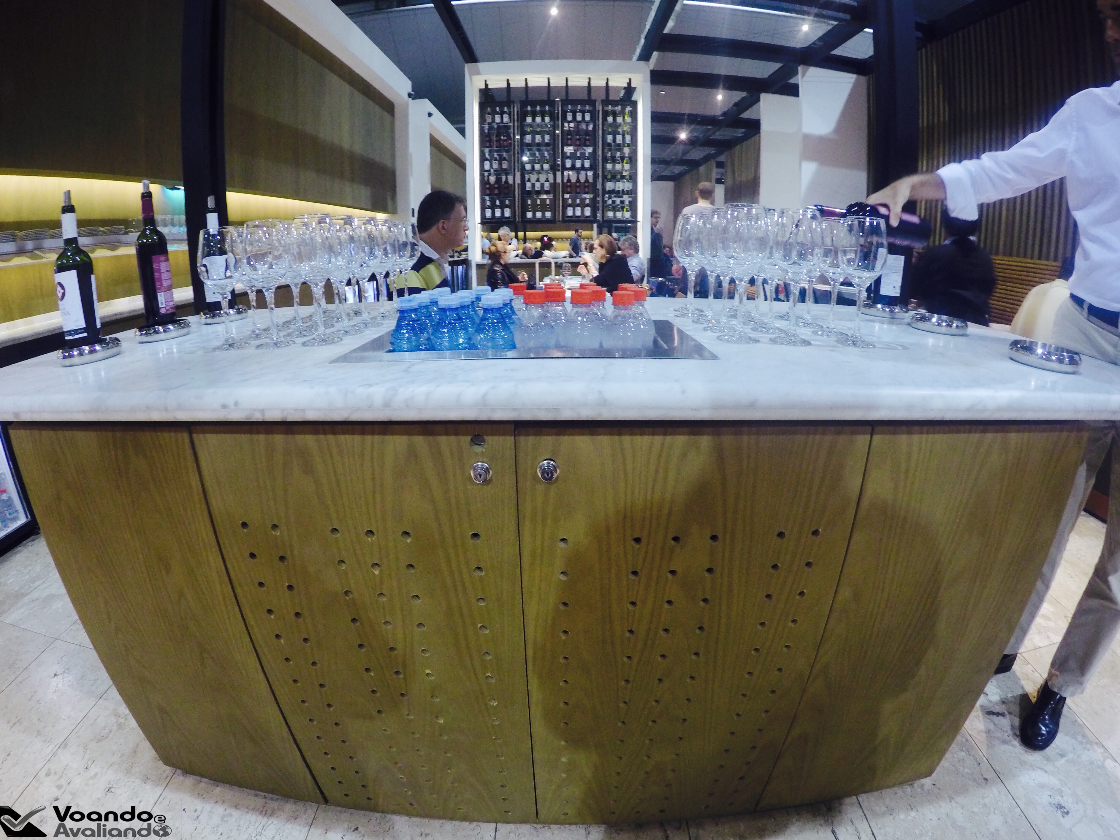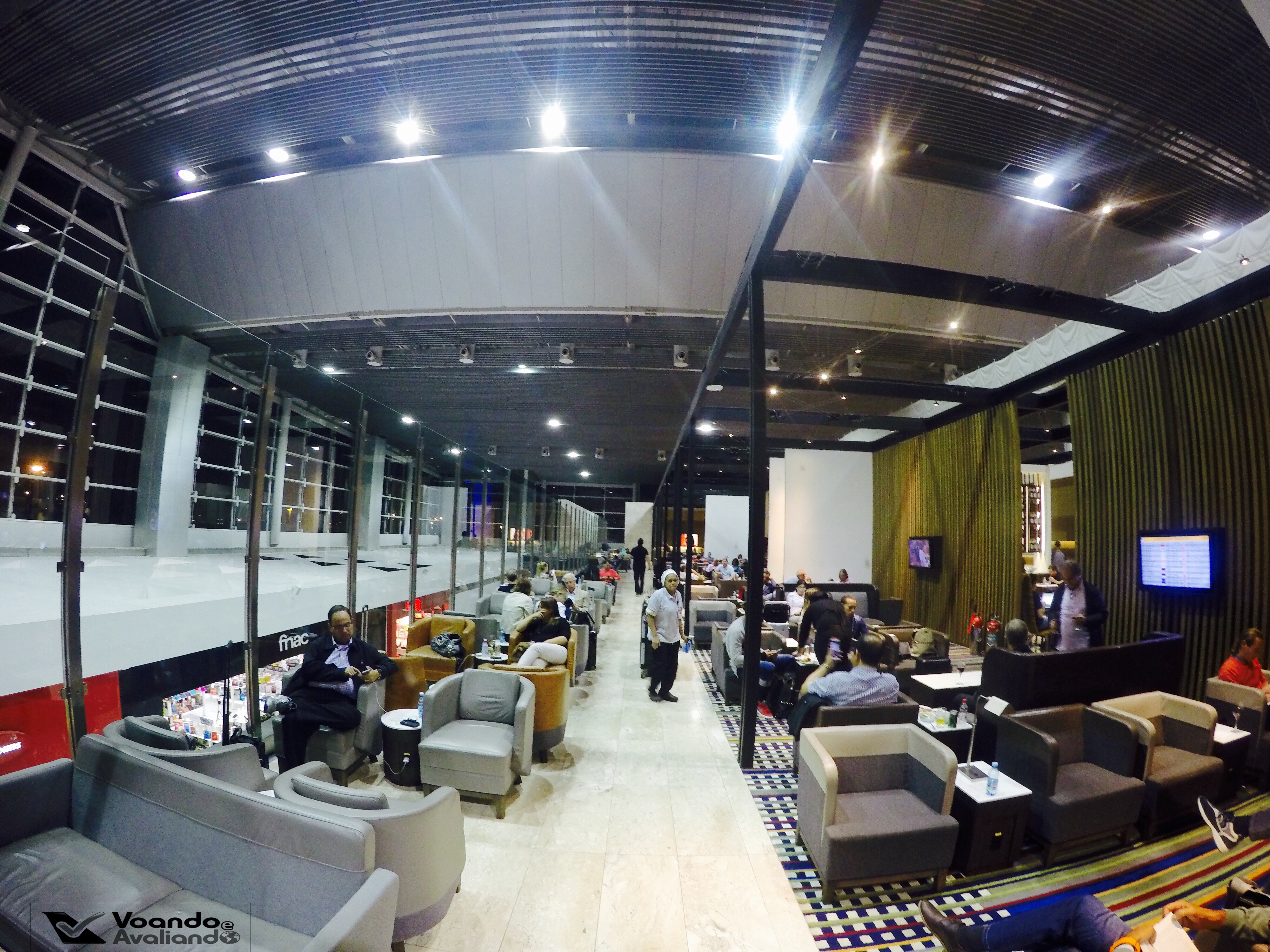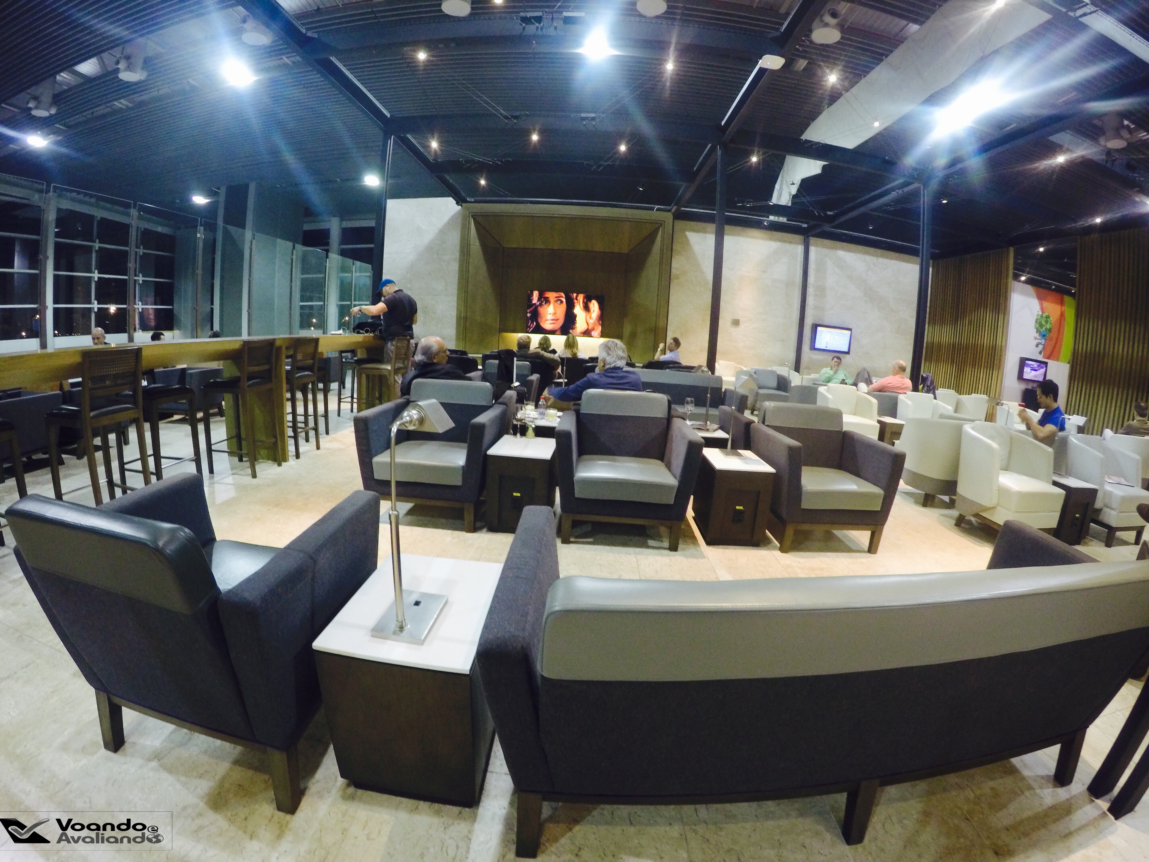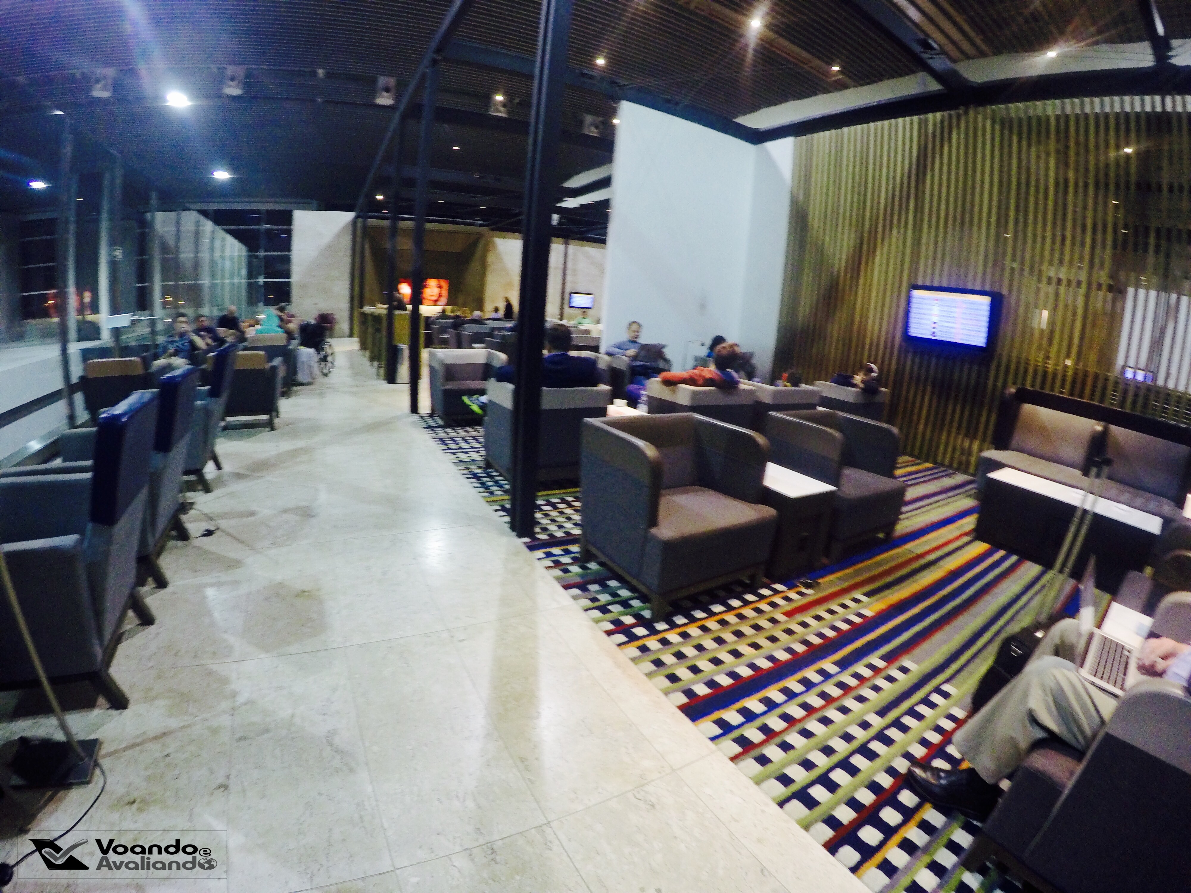 – o espaço estava bem cheio nesta noite de 4ª feira, todas as mesas instaladas perto da parte do buffet estavam ocupadas; já na parte mais social, onde há dezenas de sofás, poltronas e mesinhas um número menor de passageiros aguardava a chamada para seus voos