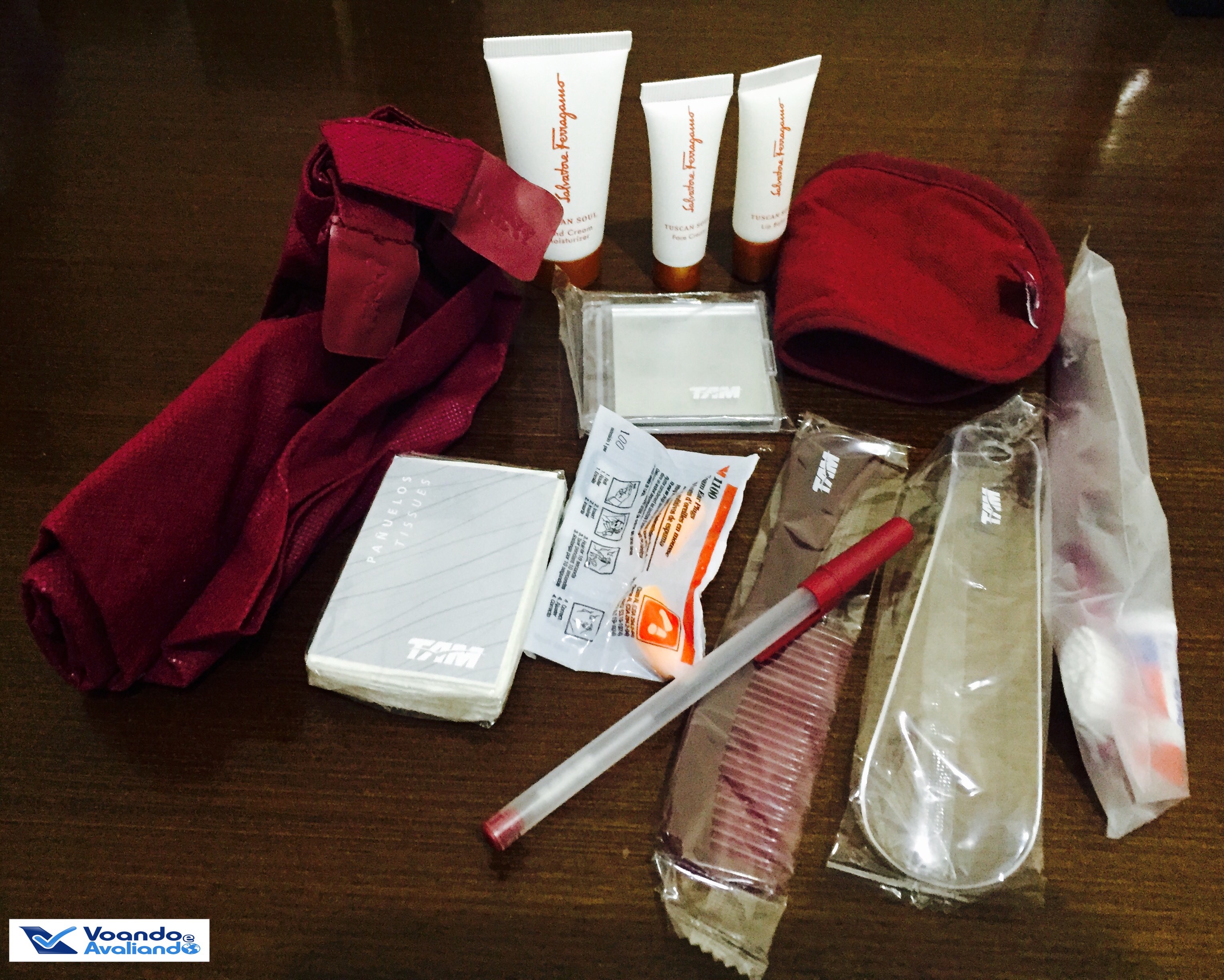 – logo depois que acomodamos as malas de mão nos bagageiros e que separei as “ferramentas” para a viagem (carregadores e máquinas), foi servido o tradicional welcome drink com um potinho de salgadinhos e foram entregues o kit com cobertor (confortável) e travesseiro (que podia ser maior) e a Necessaire (completa, com produtos da grife Salvatore Ferragamo e um mini-espelho que agrada muito às mulheres); o Capitão se dirigiu aos passageiros informando que a duração do voo até Frankfurt seria de aproximadamente 11:15h  e que pegaríamos tempo bom em rota