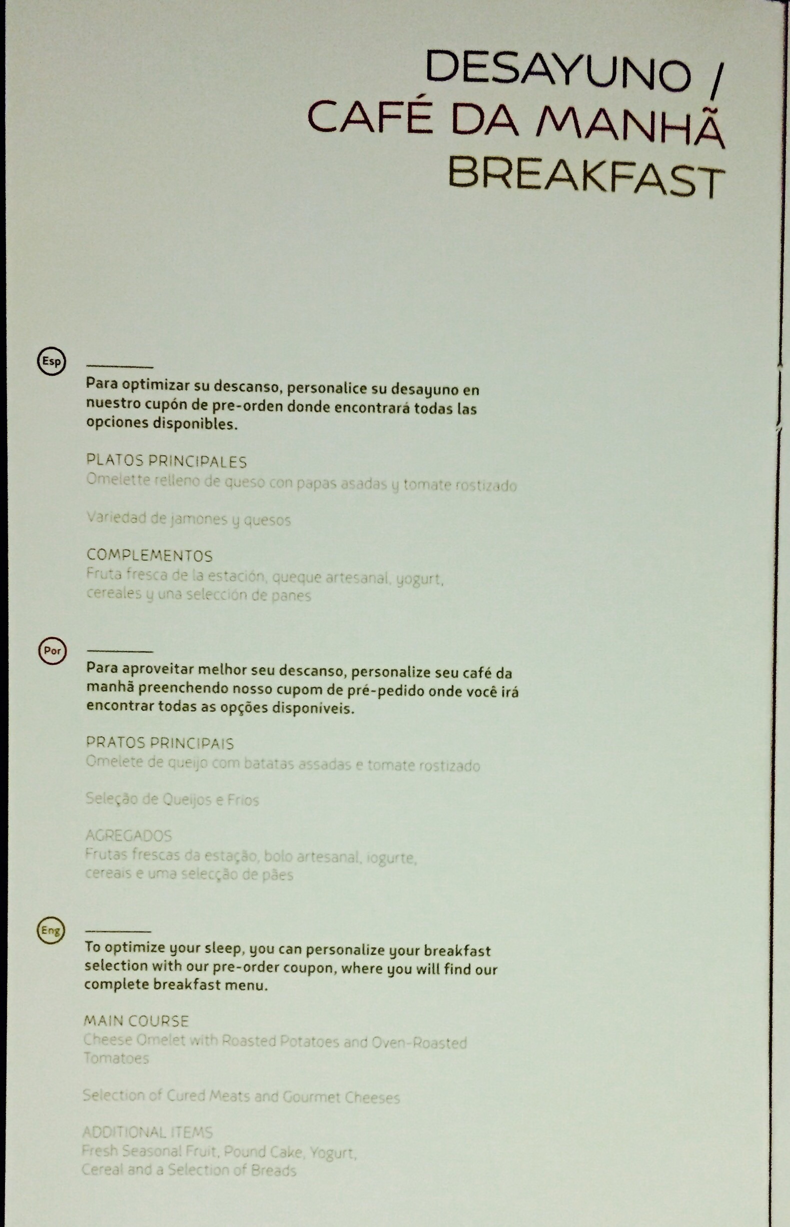 – eram 07:45h quando as Comissárias começaram a despertar os passageiros para o café da manhã (a tripulação pergunta depois do jantar se queremos ser acordados para a refeição matinal); neste momento, ainda faltavam 01:50h para o pouso em Frankfurt; o café foi efetivamente servido somente às 08:15h e foi uma boa experiência: tudo estava fresco e gostoso, o sabor do café preto me surpreendeu, estava ótimo